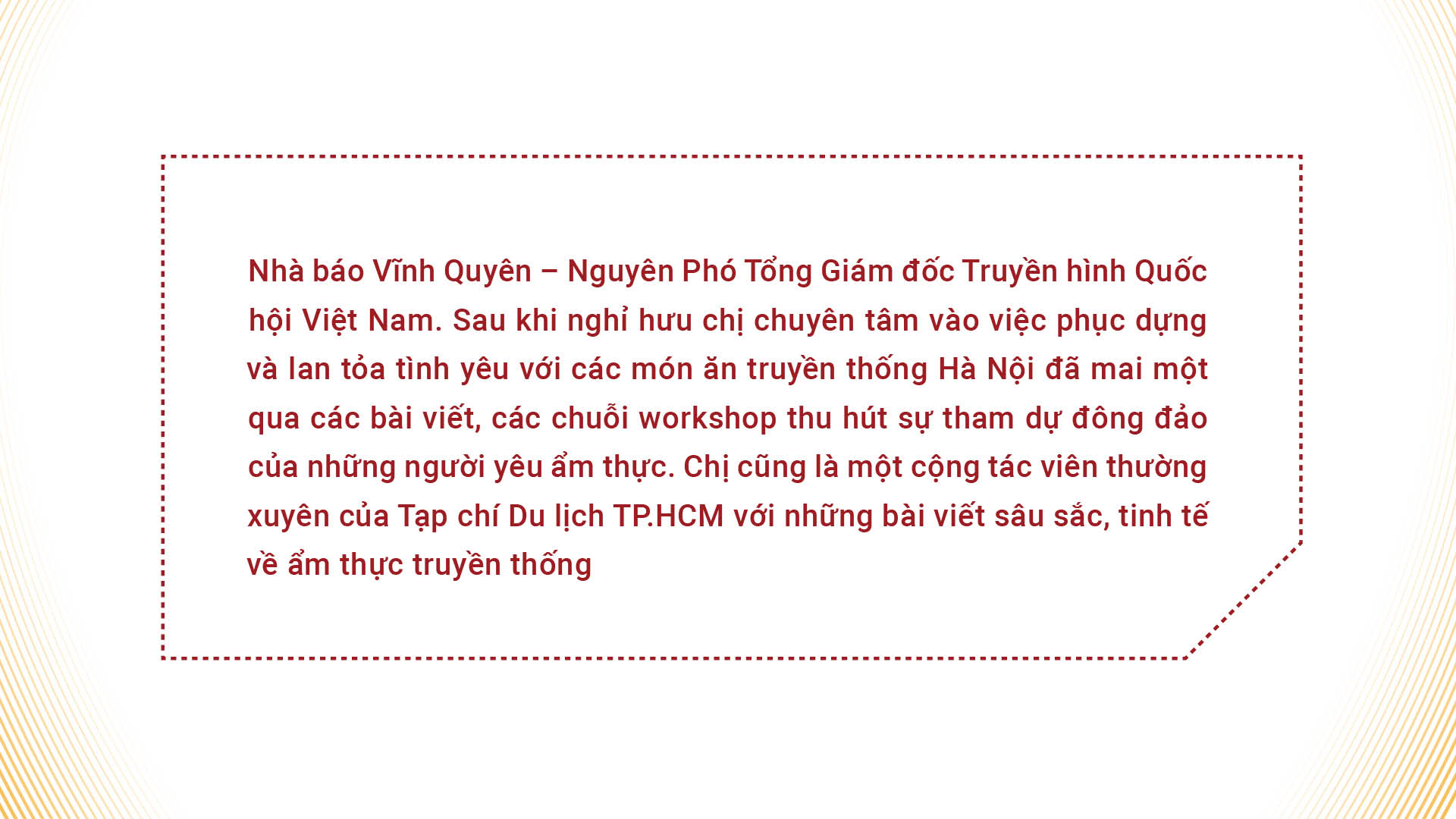 Nhiều người hỏi tôi như vậy thì những giá trị ẩm thực truyền thống Hà Nội sẽ mất đi à? Không, chắc chắn nó không mất đi vì sẽ có nhiều người như tôi vẫn lặng thầm bảo tồn những “hạt bụi vàng” của Hà Nội để những giá trị truyền thống, rất truyền thống của Hà Nội như một dòng chảy ngầm vẫn tiếp tục tồn tại, truyền từ thế hệ này sang thế hệ khác. Có thể nó không rực rỡ như ngày xưa nữa nhưng nó không mất đi hoàn toàn.Đó là điều mà tôi vẫn luôn luôn tin tưởng
