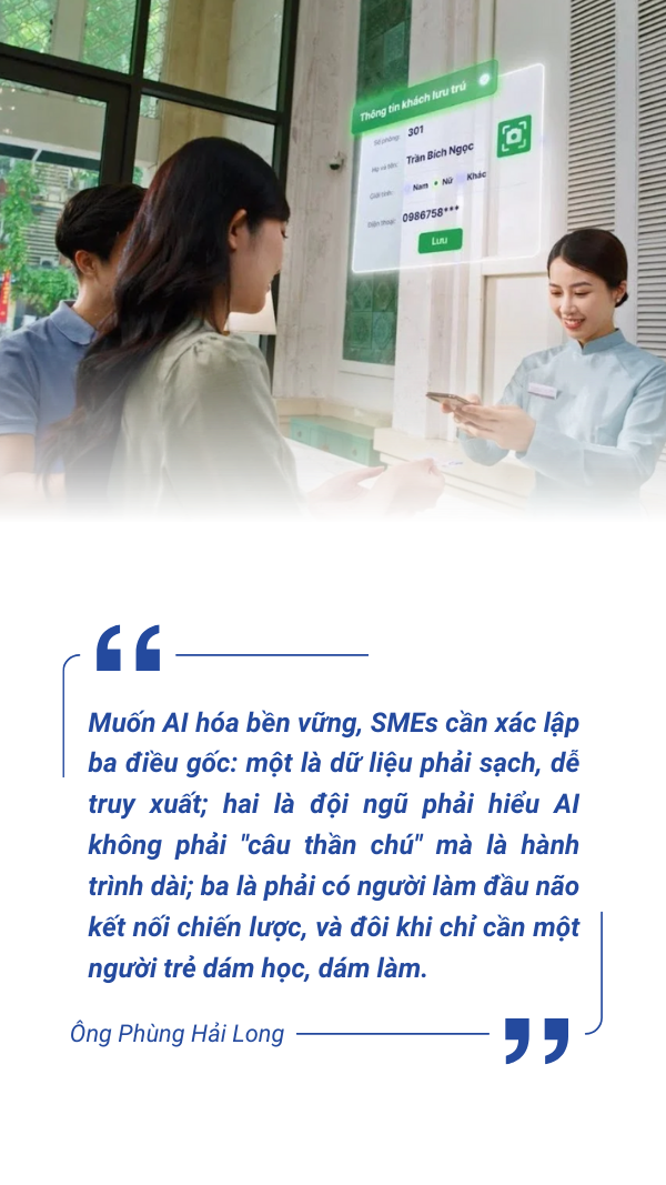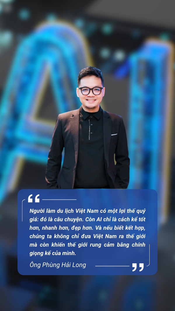 Trong chuyến làm việc với một chủ tour lữ hành bản địa ở Hội An, ông Phùng Hải Long ấn tượng với câu trả lời của 9x này về việc liệu clip quảng bá phố cổ bằng AI có làm mất “chất” địa phương: "Không, vì AI làm nền, còn hồn phố là mình truyền vào." Theo ông Long, SMEs nên coi AI là công cụ giúp đi nhanh, chứ không phải người kể chuyện thay. "Một món ăn, một góc phố, một lời chào bằng tiếng địa phương… những điều đó không nằm trong dữ liệu, mà ở trong trái tim người làm du lịch. Hãy dùng AI như chiếc cọ vẽ, nhưng bức tranh vẫn do chính mình tự vẽ, chân thực và tình cảm."