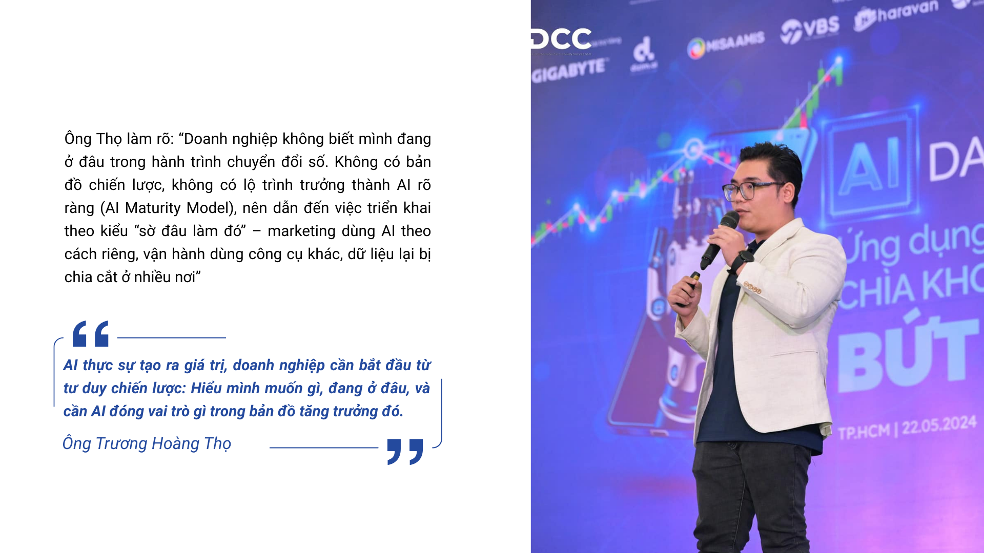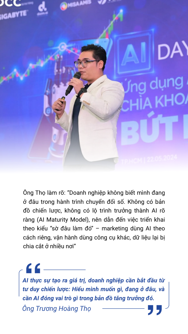 Ông Trương Hoàng Thọ (Thọ AI), đồng sáng lập Liên Minh Phát Triển Nhân Lực Số Việt Nam AIID và Nhà sáng lập Trạm Sáng Tạo Nội Dung Video với AI, nhận thấy thực trạng tương tự khi cố vấn cho một chuỗi homestay miền Bắc. Chủ doanh nghiệp đầu tư AI để viết content, chạy quảng cáo và dùng chatbot trả lời khách. Tuy nhiên, nội dung thiếu đồng nhất về ngôn ngữ thương hiệu, dữ liệu khách hàng không được lưu trữ, và không có hệ thống phân tích hiệu quả, khiến kết quả không đạt kỳ vọng. Nguyên nhân chính là việc AI được sử dụng rời rạc như “người giúp việc tạm thời”, thay vì trở thành “trợ lý chiến lược” được đào tạo bài bản và gắn với mục tiêu tăng trưởng.