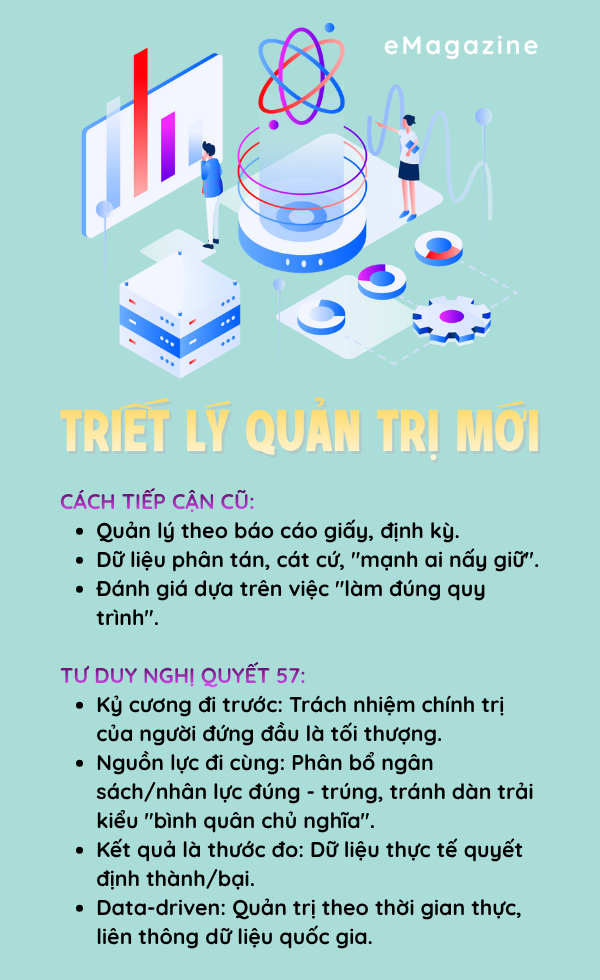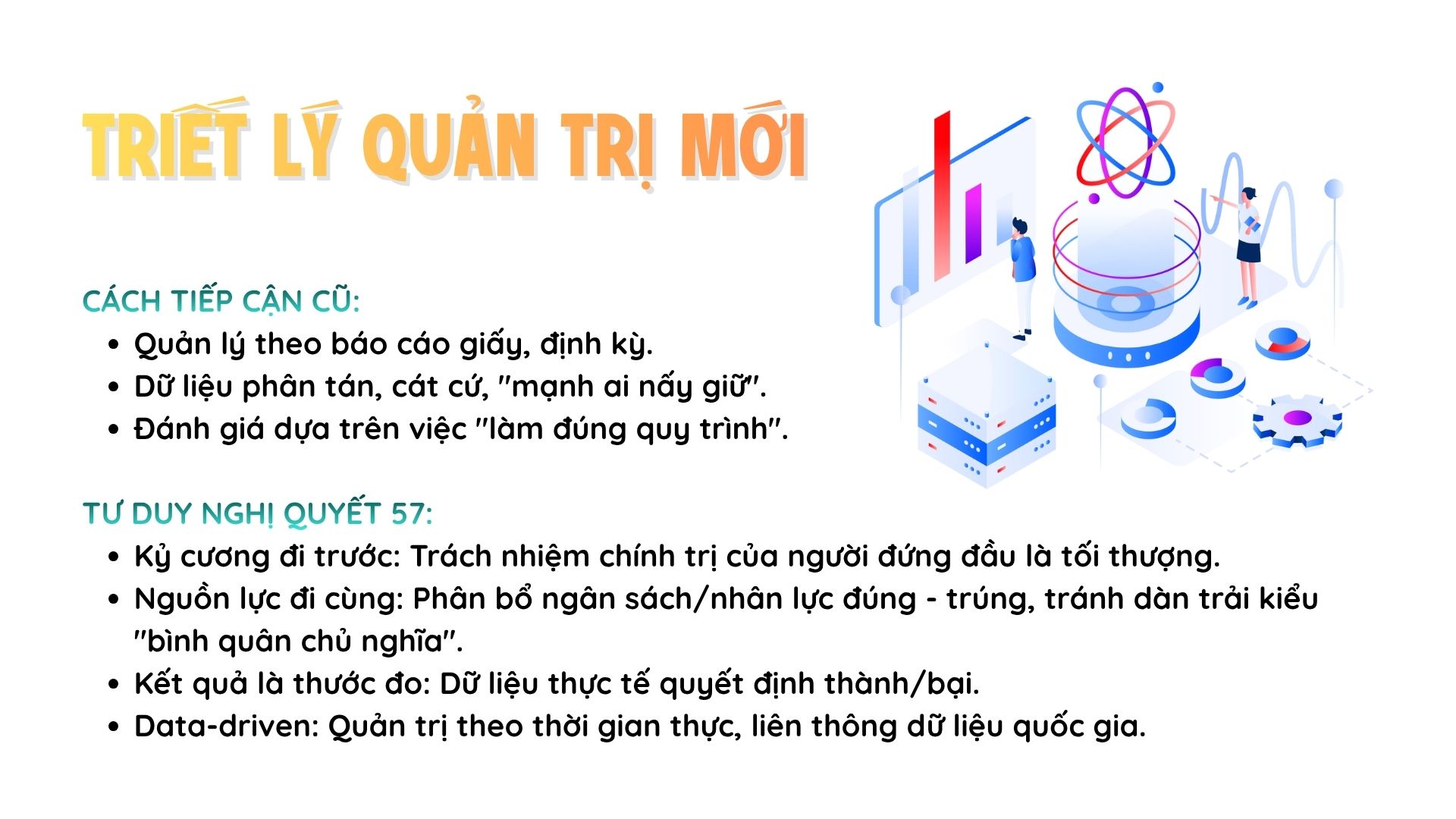 Đã qua rồi thời kỳ quản lý dựa trên những báo cáo định kỳ nằm trên giấy, nơi con số có thể được “làm đẹp” và những khó khăn có thể bị làm mờ. Nghị quyết 57 đặt nền móng cho mô hình “Data-driven governance” – Quản trị dựa trên dữ liệu. Khi các bộ ngành, địa phương buộc phải sử dụng Hệ thống thông tin giám sát thời gian thực, quyền lực giám sát đã thay đổi về chất. Dữ liệu không biết nói dối. Thông tin phơi bày sự trì trệ, nhưng cũng tôn vinh những nỗ lực thực chất.