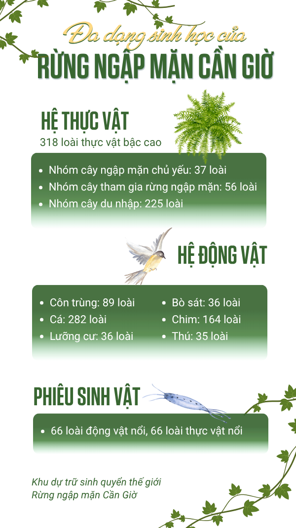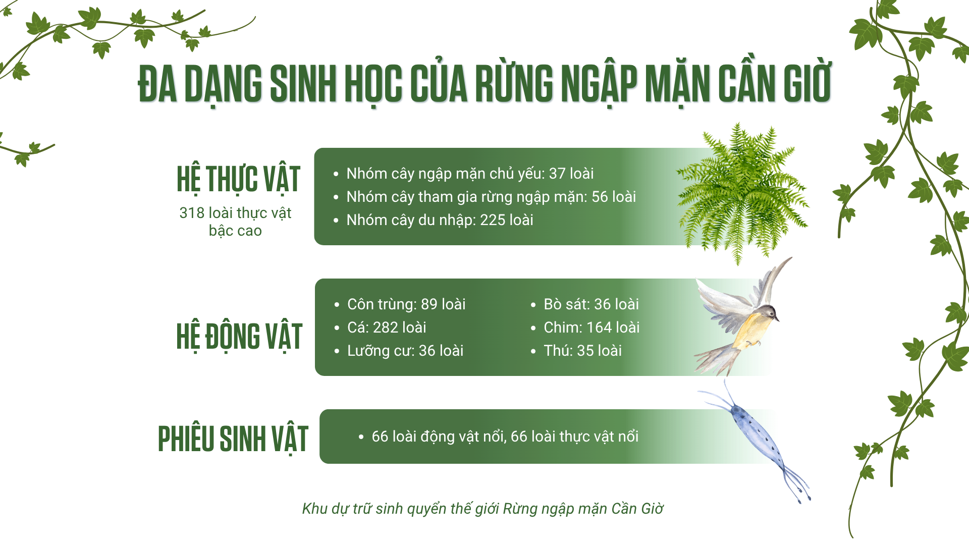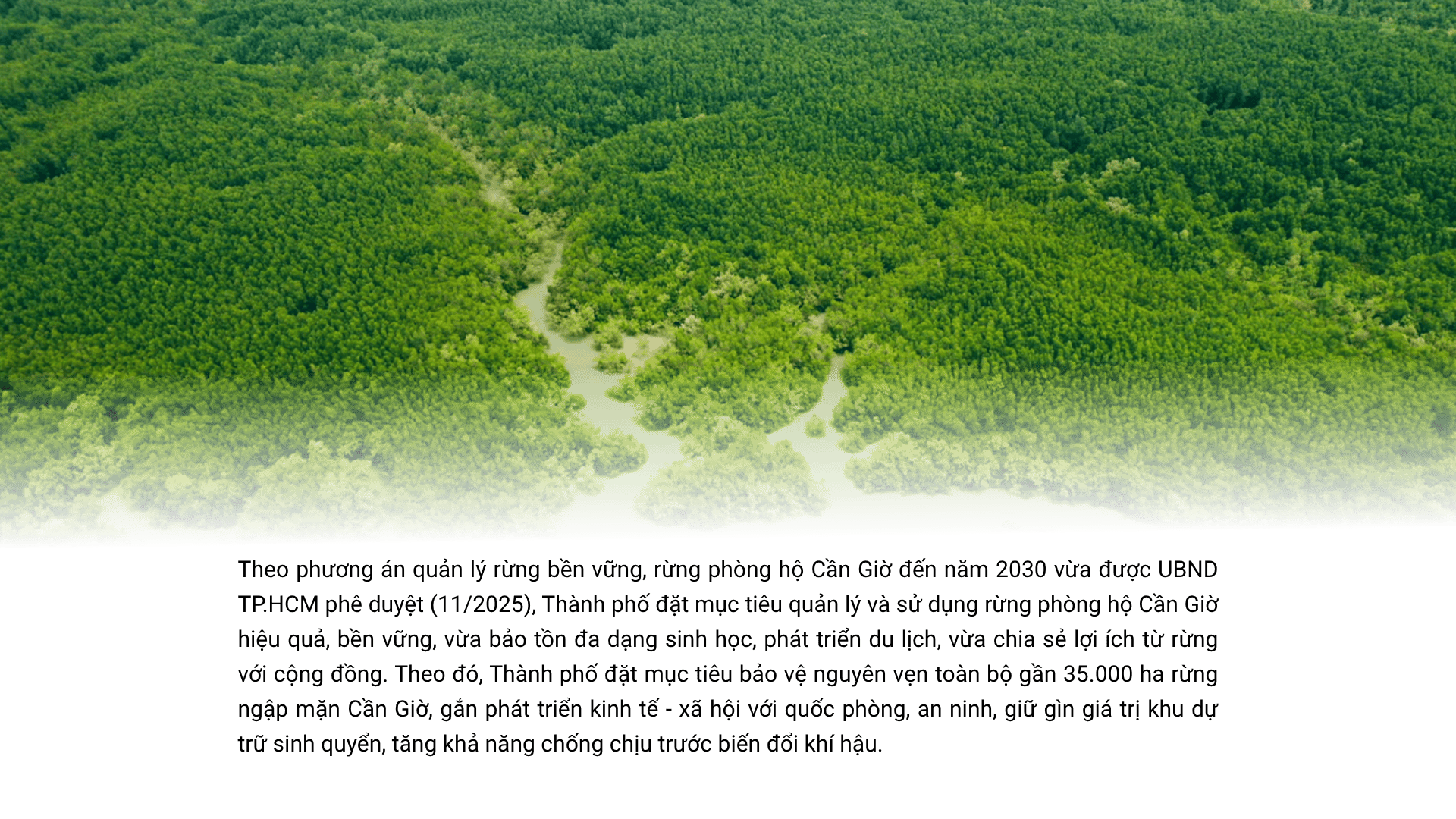 Cần Giờ có mạng lưới hàng trăm sông rạch chằng chịt lớn nhỏ thuộc hạ lưu hệ thống sông Đồng Nai - Sài Gòn, vừa ôm trọn, vừa chia cắt vùng đất này. Sau năm 1975, rừng ngập mặn ở đây bị tàn phá, hủy diệt nghiêm trọng. Trong công cuộc tái thiết, với tầm nhìn và quyết tâm phủ xanh, trồng lại rừng trên diện tích rộng lớn của lãnh đạo Thành phố, cùng biết bao người dân đã đổ sức chung tay, chỉ trong thời gian ngắn, rừng ngập mặn Cần Giờ được hồi sinh ngoạn mục, “trả lại” màu xanh của sự sống.