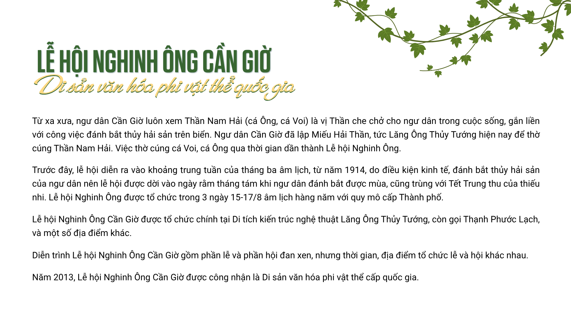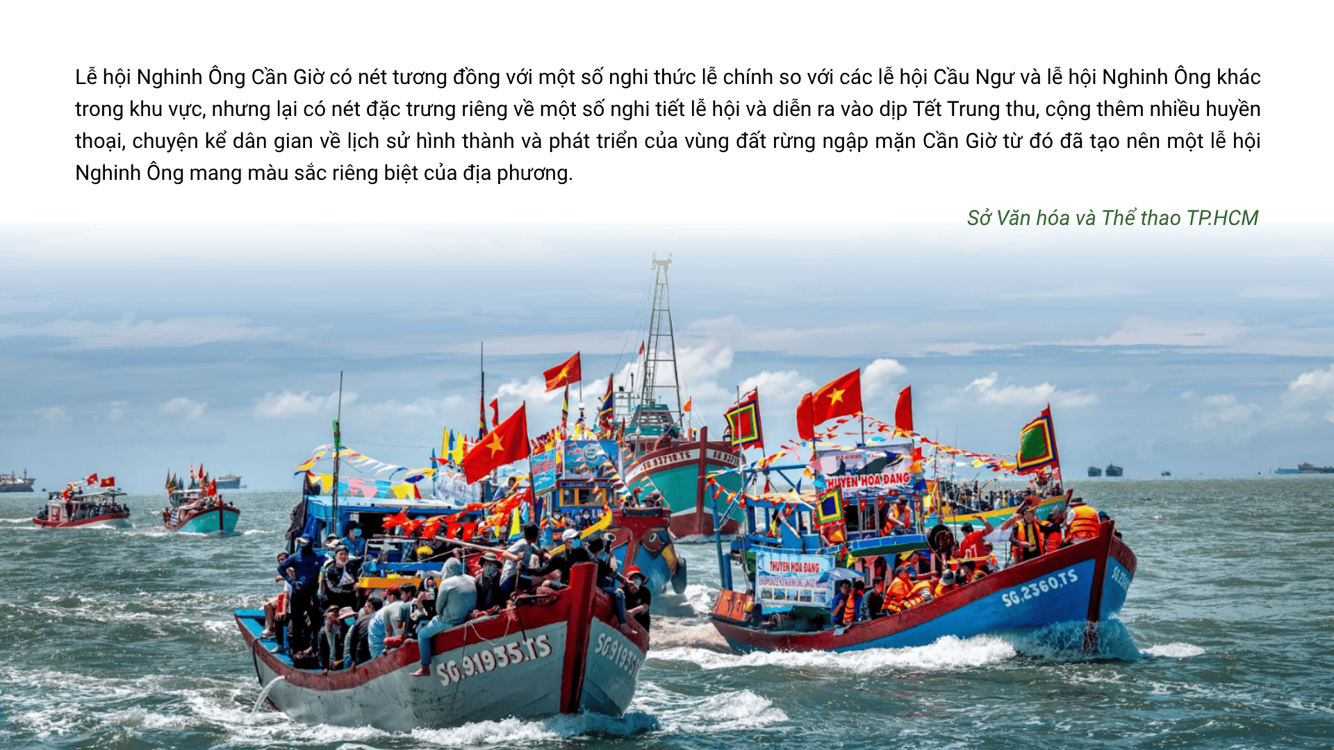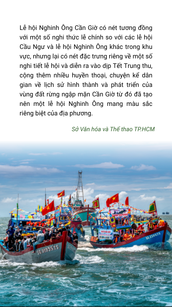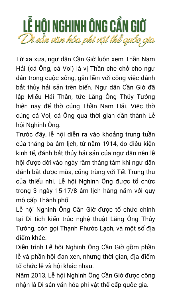 Sau lớp cư dân cổ, giai đoạn muộn hơn, Cần Giờ lưu dấu bước chân người Việt theo sông biển xuôi về phương Nam. Khai phá vùng đất mới, họ hình thành các cộng đồng dân cư, nhẫn nại lao động, mưu sinh, khai thác các nguồn lợi thông qua hoạt động nông, lâm, ngư, diêm nghiệp; đồng thời, không ngừng kết tụ, vun bồi đời sống tinh thần đậm đà bản sắc. Tiêu biểu như Lễ hội Nghinh Ông Cần Giờ, “Tết Biển” của cộng đồng ngư dân phản ánh tín ngưỡng thờ thần Nam Hải - cá Ông, cá Voi của ngư dân, gắn với di tích Lăng Ông Thủy Tướng - Thạnh Phước Lạch, diễn ra tháng Tám âm lịch hàng năm, nay là Di sản văn hóa phi vật thể quốc gia.