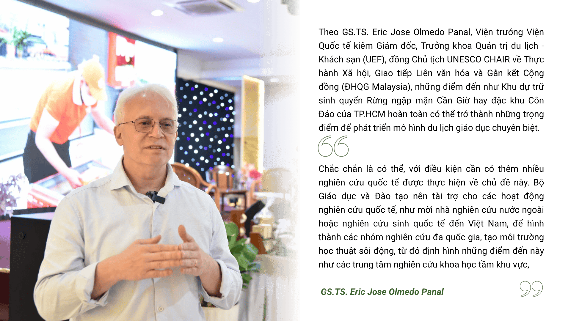 “Khu dự trữ sinh quyển thế giới Rừng ngập mặn Cần Giờ, được UNESCO công nhận, mang lại cơ hội vô giá để phát triển du lịch giáo dục, không chỉ thông qua việc học lý thuyết về môi trường mà còn tham gia vào các hoạt động thực tế như trồng rừng ngập mặn, nghiên cứu hệ sinh thái và bảo vệ động thực vật. Các chương trình tại đây giúp du khách phát triển kỹ năng thực hành và tăng cường nhận thức về bảo vệ tài nguyên thiên nhiên”, TS. Tạ Duy Linh phân tích.