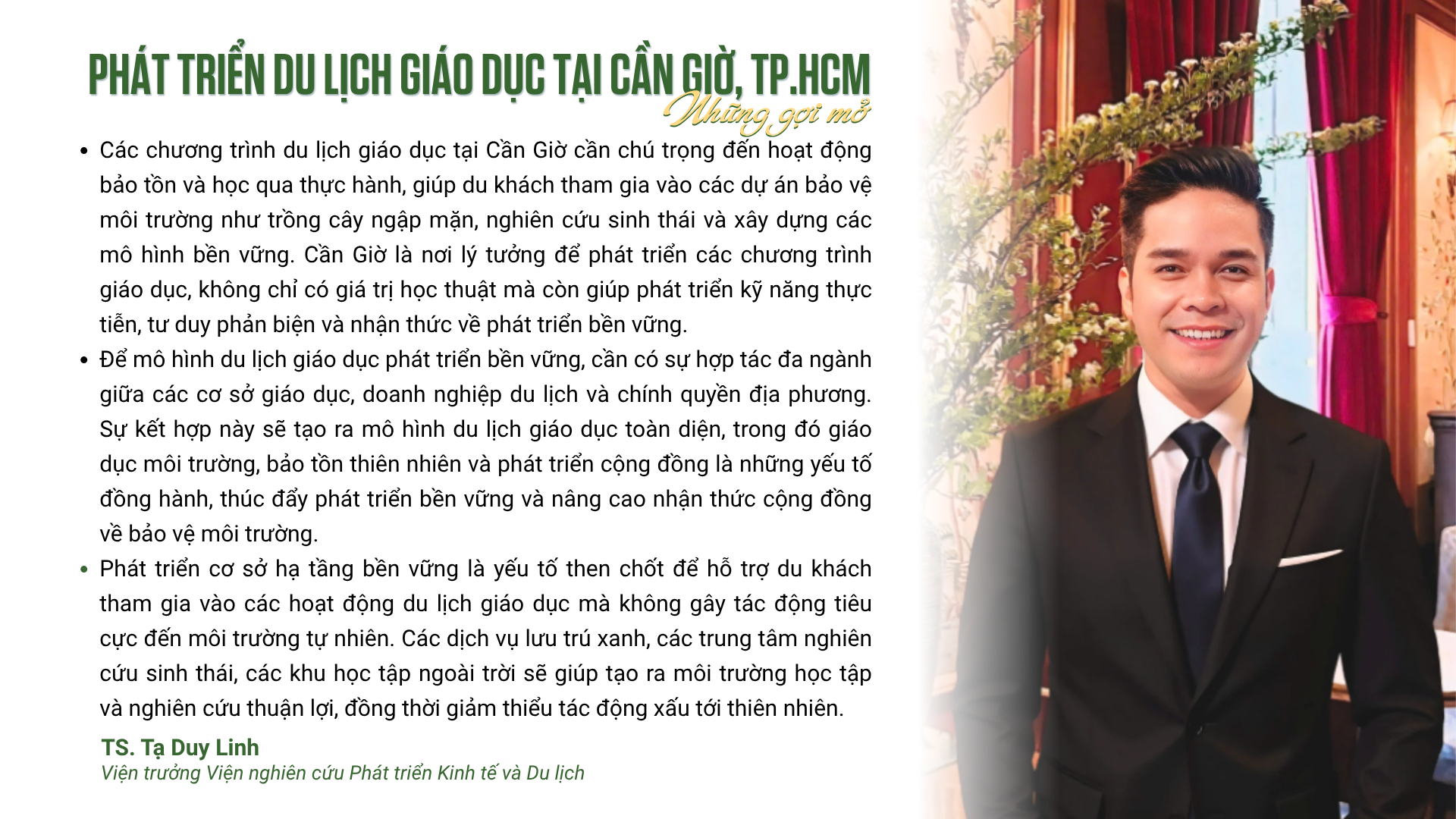 TS. Tạ Duy Linh, Viện trưởng Viện nghiên cứu Phát triển Kinh tế và Du lịch kỳ vọng về tiềm năng phát triển du lịch giáo dục cho Cần Giờ. Theo ông, Cần Giờ nên là điểm sáng ưu tiên trong chiến lược phát triển du lịch giáo dục tại TP.HCM, bởi với tiềm năng của mình, Cần Giờ không chỉ phát triển giáo dục mà còn thúc đẩy phát triển bền vững trong khu vực.