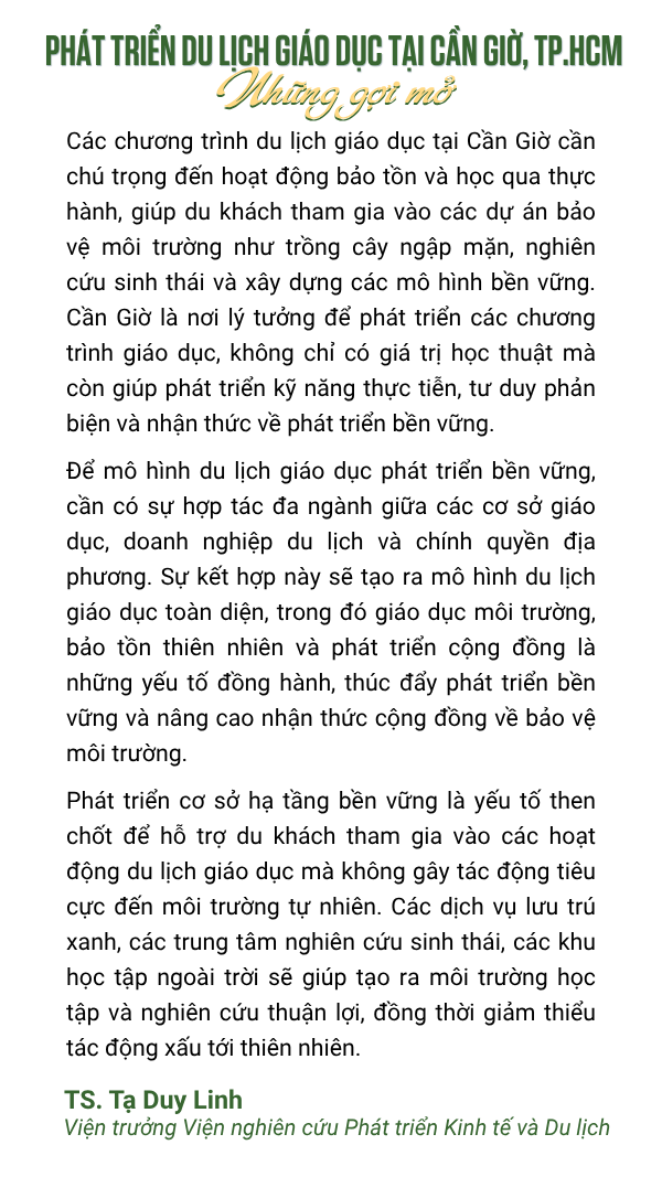 “Cần Giờ có thể trở thành mô hình mẫu cho du lịch giáo dục bền vững, kết hợp giữa giáo dục bảo vệ môi trường, bảo tồn đa dạng sinh học và phát triển cộng đồng. Mô hình này không chỉ nâng cao nhận thức cộng đồng về bảo vệ tài nguyên thiên nhiên mà còn tạo cơ hội phát triển kinh tế bền vững cho người dân địa phương thông qua du lịch sinh thái và các hoạt động cộng đồng”, TS. Tạ Duy Linh khẳng định.