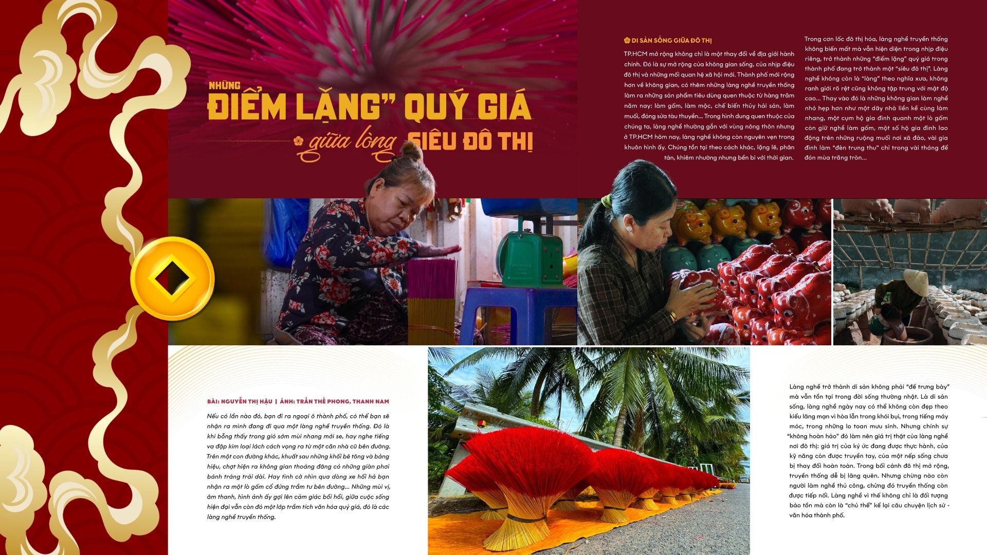 TP.HCM mở rộng giống như một dòng sông lớn. Cuộc sống thành phố trôi đi rất nhanh. Trong dòng chảy ấy có thể coi làng nghề là những “bến đậu” cho đời sống đô thị, là “điểm neo” của ký ức cộng đồng. Làng nghề, cũng như những không gian truyền thống khác như chợ dân sinh, đình, chùa, đền miếu... không phải là yếu tố cản ngăn dòng chảy cuộc sống mà là để giúp con người không bị cuốn trôi hoàn toàn khỏi quá khứ.