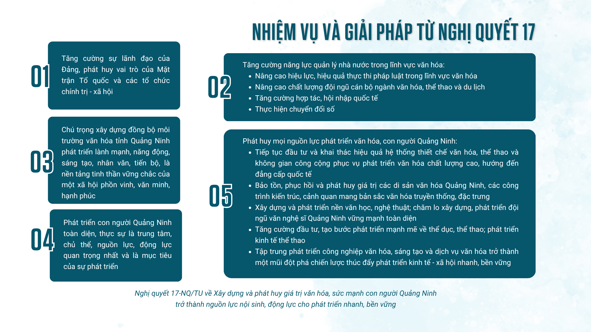 Nhằm tiếp tục xây dựng và phát huy giá trị văn hóa, sức mạnh con người Quảng Ninh trở thành nguồn lực nội sinh, động lực cho phát triển nhanh, bền vững, Nghị quyết số 17-NQ/TU của Tỉnh ủy Quảng Ninh về Xây dựng và phát huy giá trị văn hóa, sức mạnh con người Quảng Ninh trở thành nguồn lực nội sinh, động lực cho phát triển nhanh, bền vững vạch ra 5 nhiệm vụ và giải pháp trọng tâm, cụ thể cho hệ thống chính trị, Đảng bộ, Chính quyền và Nhân dân cùng thực hiện.