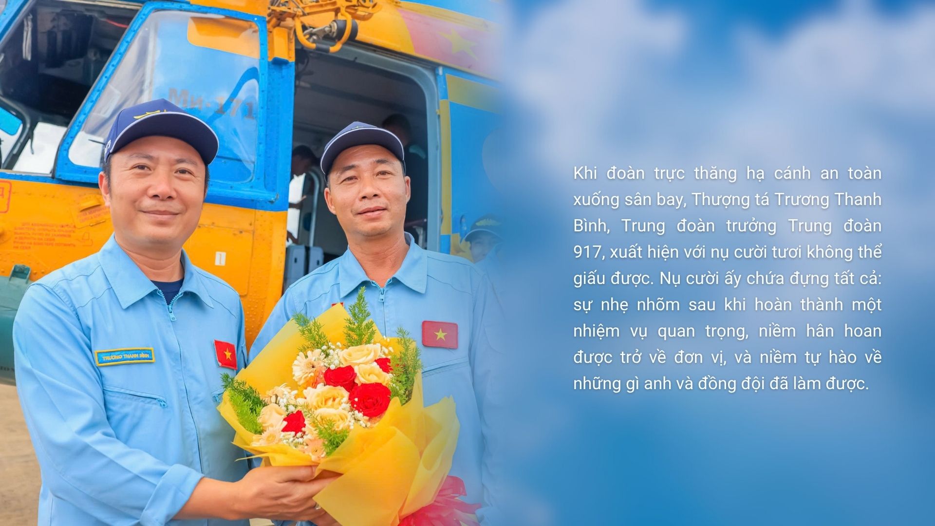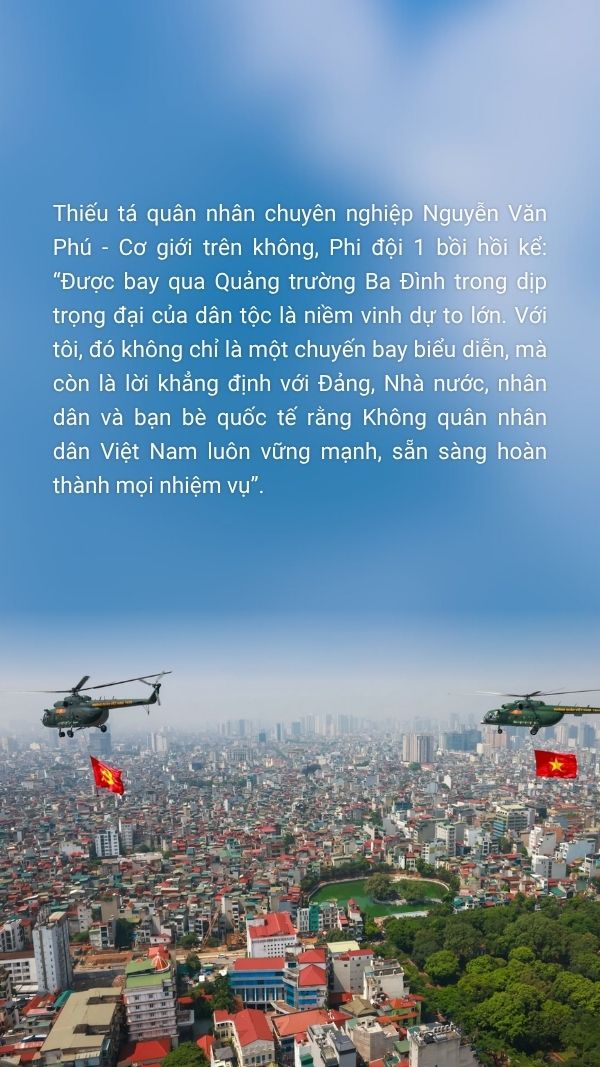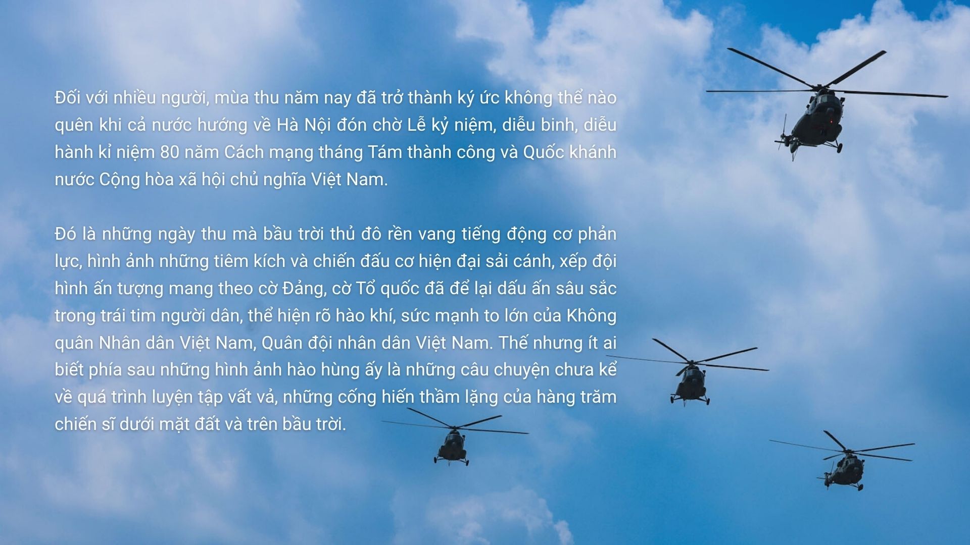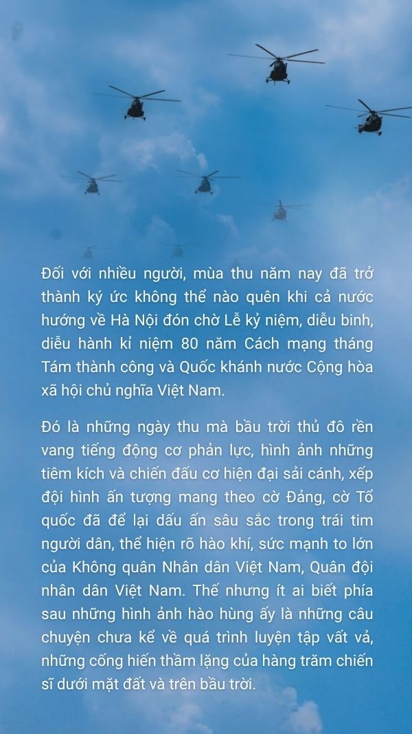 Khác với những đồng chí, đồng đội của các Khối khác, nhiệm vụ của các chiến sĩ Quân chủng Phòng không Không quân - những phi công trực tiếp điều khiển các biên đội máy bay, trực thăng chỉ thực sự kết thúc khi những chiếc máy bay hạ cánh, trở về sân đỗ an toàn trong vòng tay đồng đội. Không có tiếng hò reo của người dân, không có người thân bên cạnh, nhưng với họ, khoảnh khắc tỏa sáng trên bầu trời Tổ quốc khi phía dưới là rợp màu cờ hoa rực rỡ của hàng triệu con tim chung nhịp đập đã là một phần thưởng vô giá.