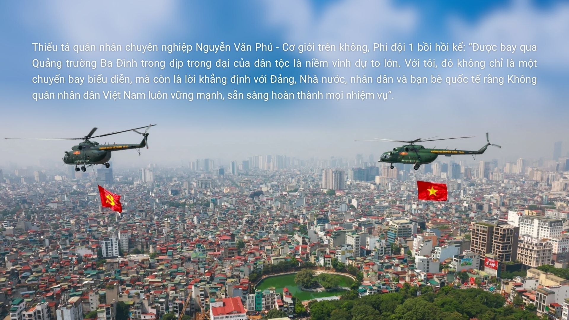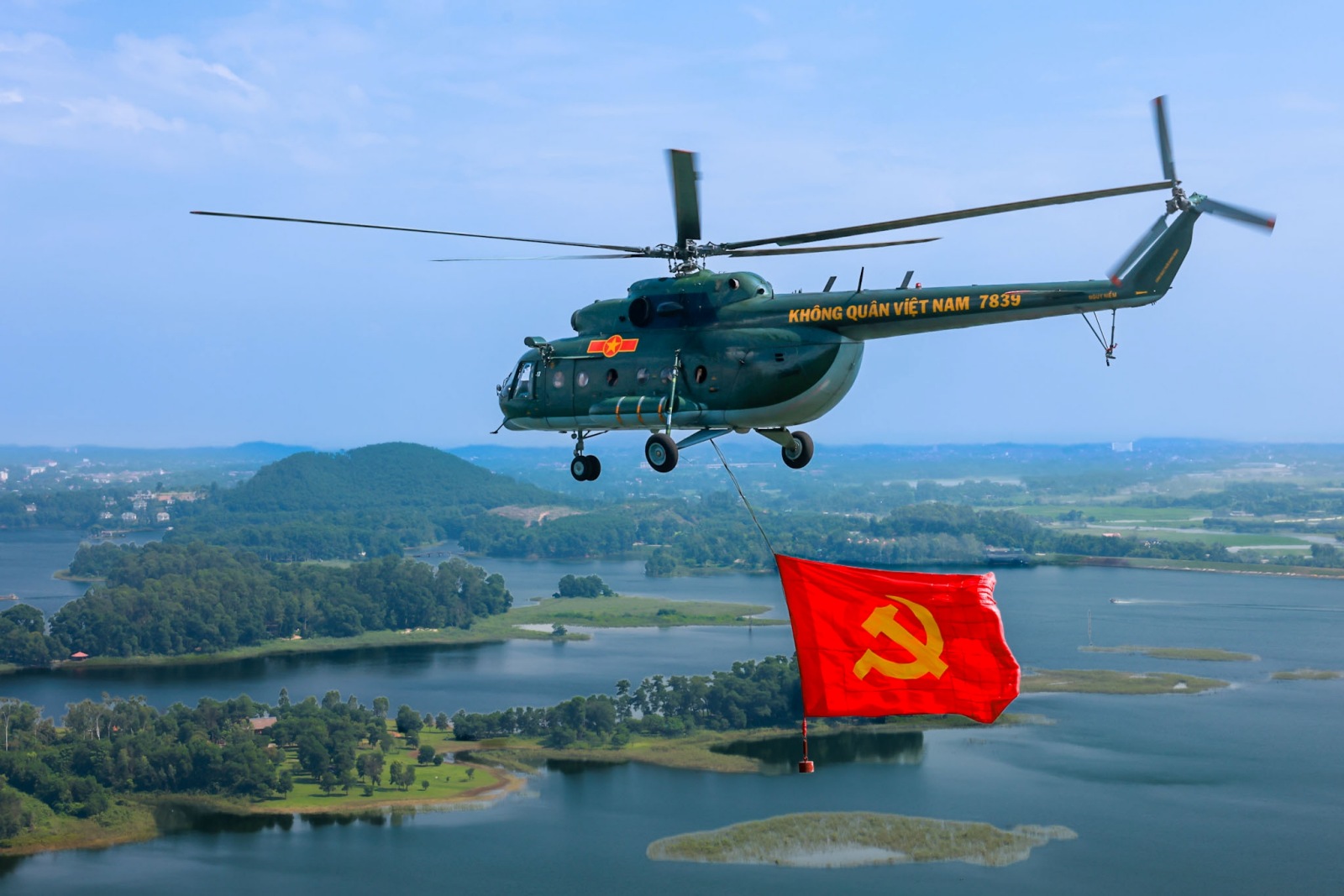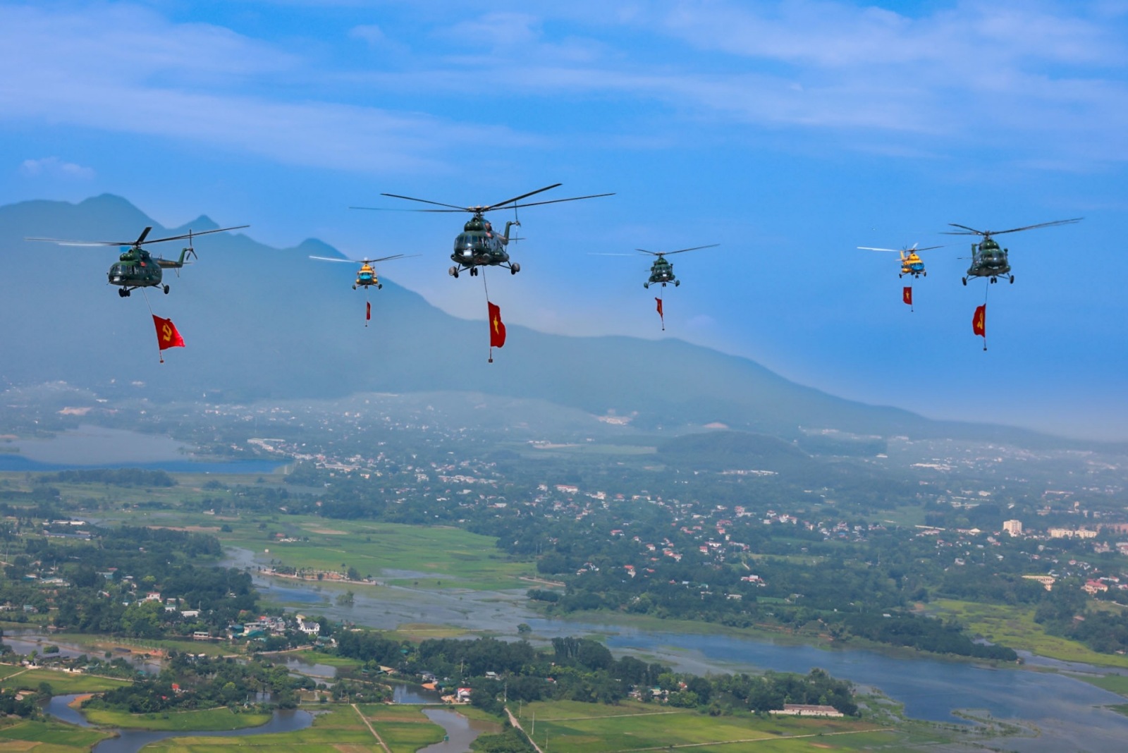 Từ sân bay Kép (Lạng Giang - Bắc Ninh), Hòa Lạc và Gia Lâm (Hà Nội) những biên đội máy bay gồm Su-30MK2, trực thăng Mi-171, Mi-8, Mi-17, huấn luyện Yak-130 và L-39NG, máy bay vận tải Casa C-295 và C212i… liên tục cất, hạ cánh, thực hiện các bài bay đội hình, bay trình diễn kỹ thuật phức tạp. Biên đội trực thăng Mi thực hiện nhiệm vụ kéo cờ Đảng, cờ Tổ quốc qua quảng trường Ba Đình. Mỗi lá cờ với chiều dài 5,4m, rộng 3,6m được neo bằng dây cáp và một quả tạ treo phía dưới - tất cả đều được tính toán và kiểm tra kỹ lưỡng trong điều kiện bay hành tiến với tốc độ hơn 100km/h.