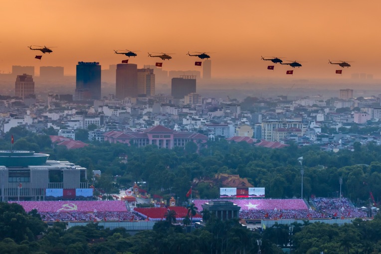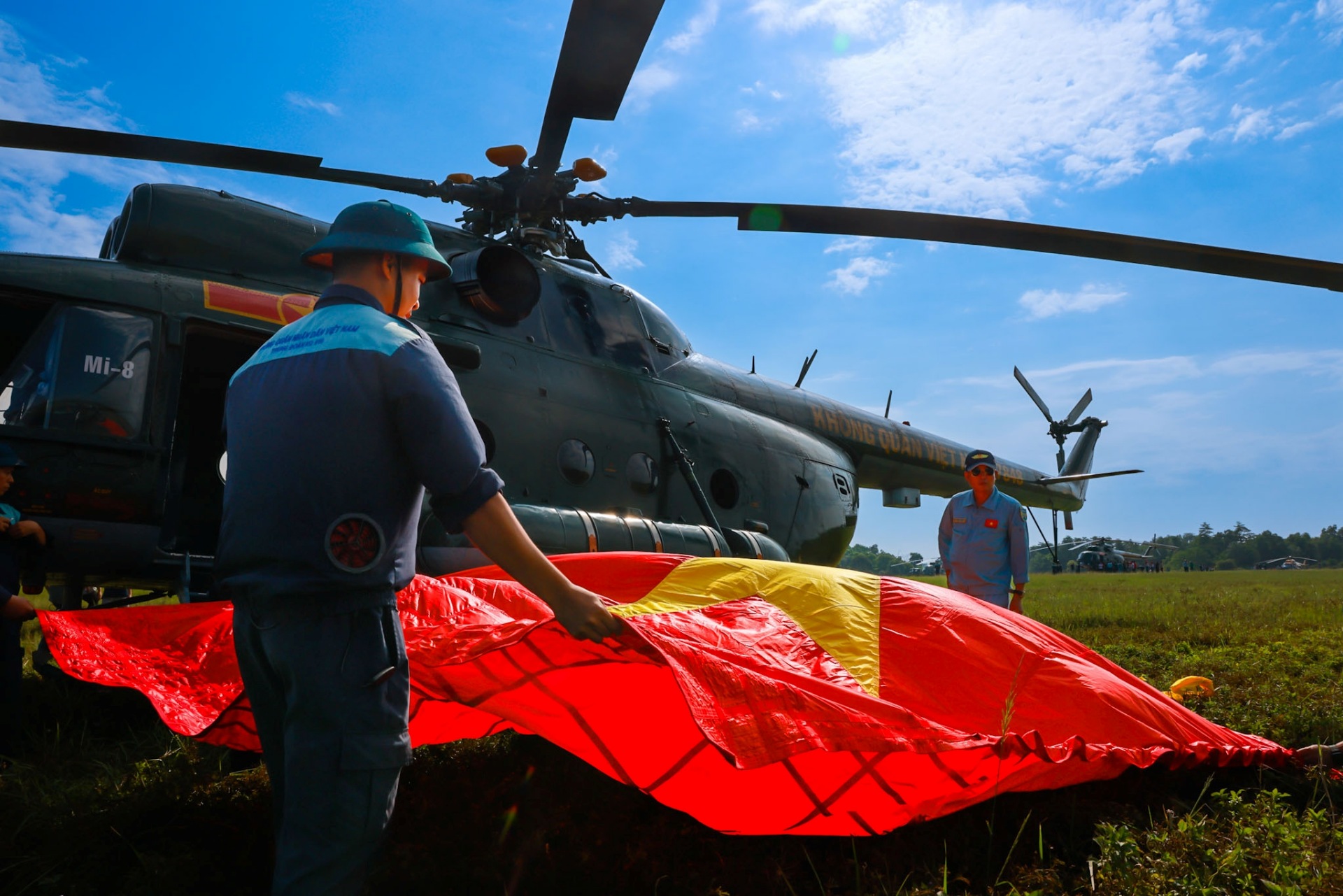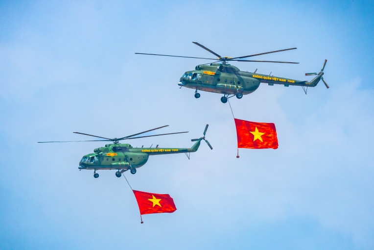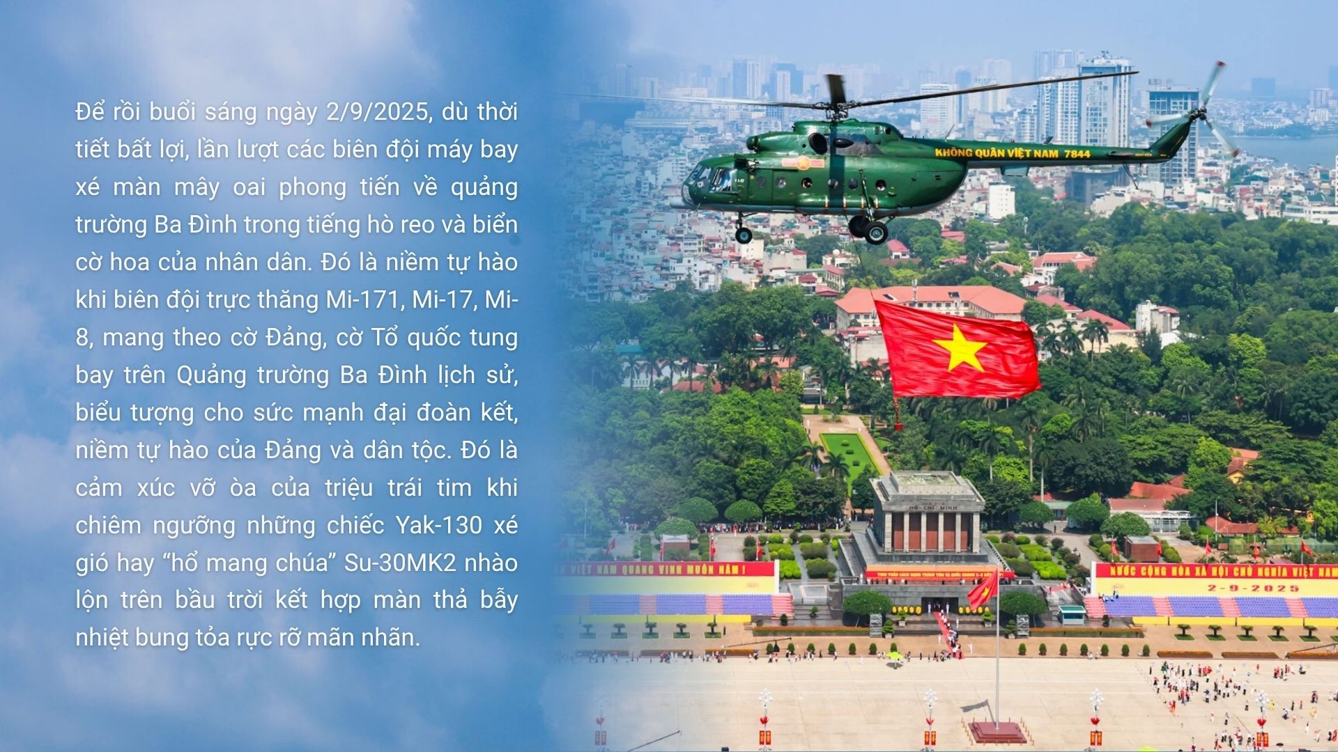 Từ sân bay Kép (Lạng Giang - Bắc Ninh), Hòa Lạc và Gia Lâm (Hà Nội) những biên đội máy bay gồm Su-30MK2, trực thăng Mi-171, Mi-8, Mi-17, huấn luyện Yak-130 và L-39NG, máy bay vận tải Casa C-295 và C212i… liên tục cất, hạ cánh, thực hiện các bài bay đội hình, bay trình diễn kỹ thuật phức tạp. Biên đội trực thăng Mi thực hiện nhiệm vụ kéo cờ Đảng, cờ Tổ quốc qua quảng trường Ba Đình. Mỗi lá cờ với chiều dài 5,4m, rộng 3,6m được neo bằng dây cáp và một quả tạ treo phía dưới - tất cả đều được tính toán và kiểm tra kỹ lưỡng trong điều kiện bay hành tiến với tốc độ hơn 100km/h.