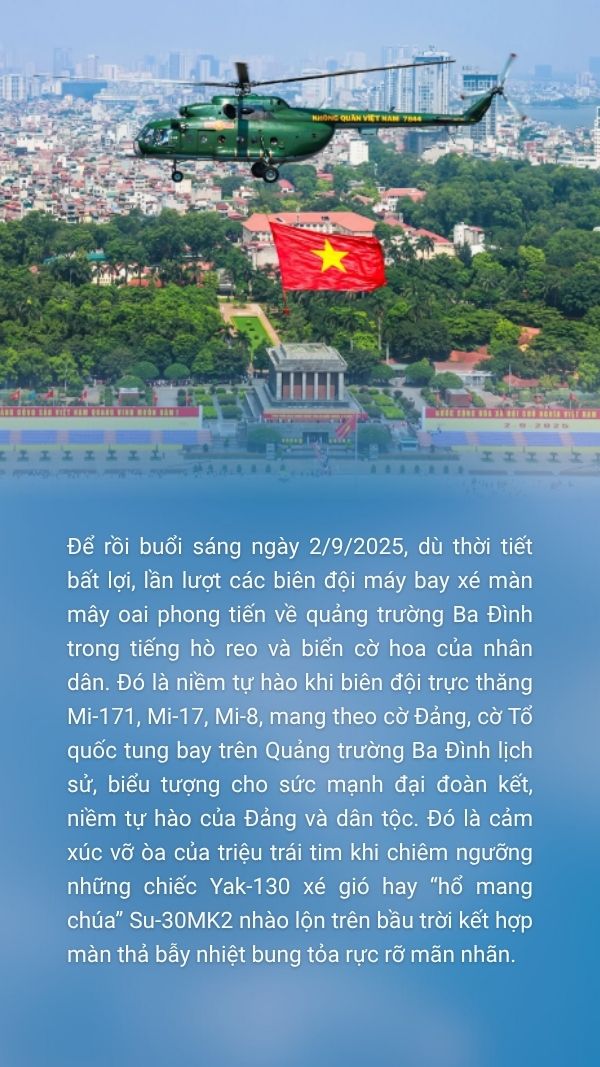 Màn trình diễn không chỉ phô diễn sức mạnh quân sự, mà còn gửi gắm thông điệp về ý chí, quyết tâm gìn giữ hòa bình, độc lập, chủ quyền quốc gia. Mỗi đường bay, mỗi đội hình đều toát lên niềm tự hào dân tộc, là kết quả của quá trình rèn luyện kiên trì, nghiêm túc của lực lượng Không quân nhân dân Việt Nam trong suốt nhiều tháng qua.