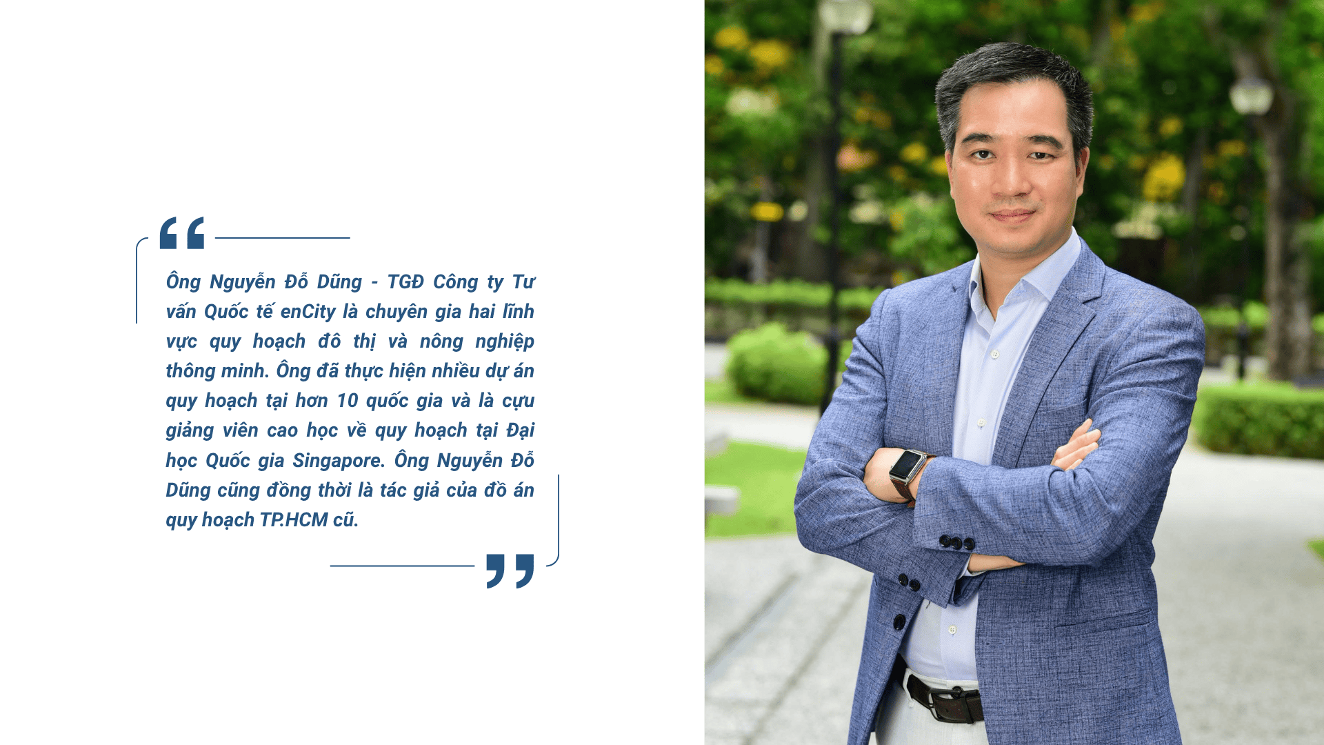 Ông Nguyễn Đỗ Dũng: Một thành phố đáng sống phải có sắc xanh ở khắp nơi. Ngay ở trung tâm, khu vực Thủ Thiêm vẫn còn đất cho công viên. Trong quy hoạch cũ chúng tôi cũng đã xây khung xanh dựa trên ba dòng sông chính. Quy hoạch đồng thời xác định rõ khu nào được bê tông hóa, khu nào dành cho logistics.