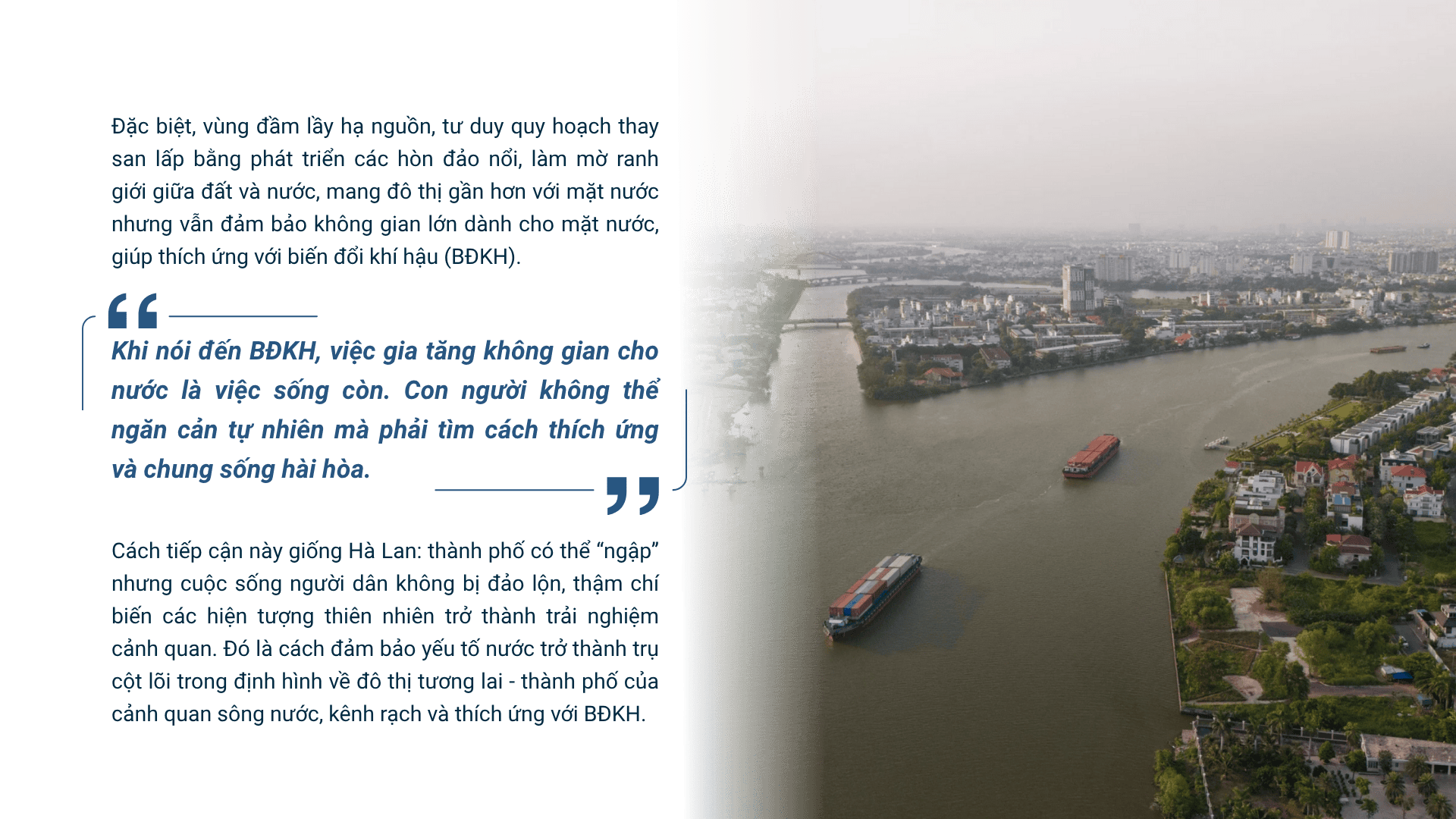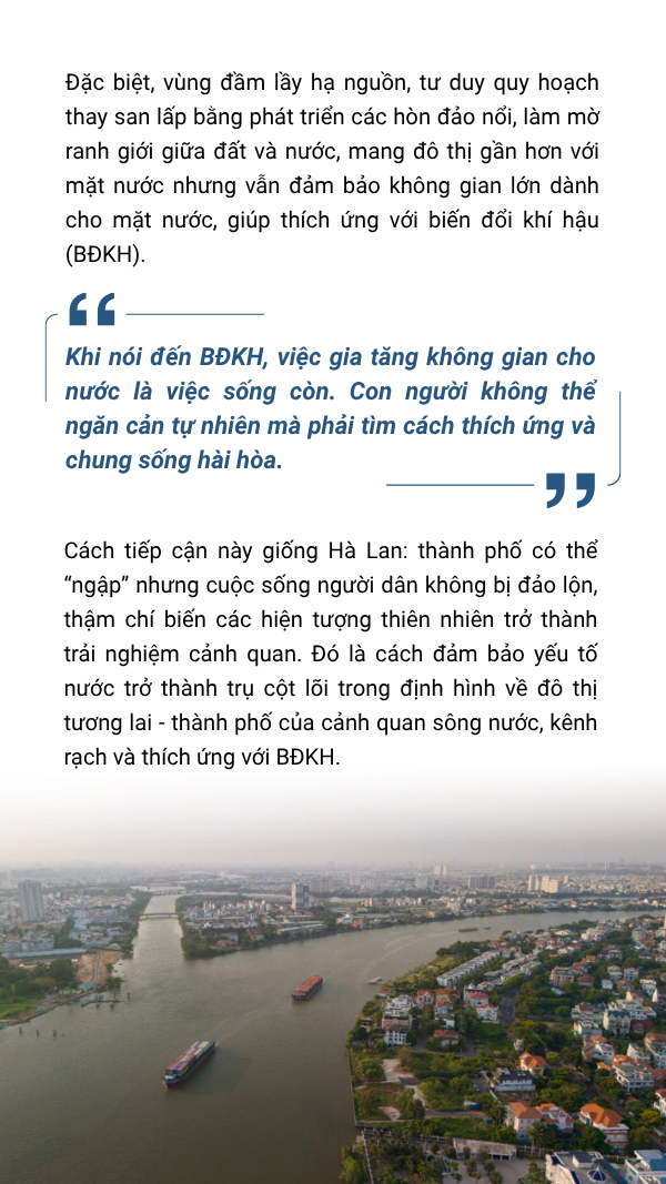 TP.HCM là điểm hợp lưu dòng chảy với hai con sông lớn đi qua cùng hệ thống kênh rạch dày đặc và nước được ví như mạch chảy của đô thị. Theo ông, yếu tố “nước” đã và nên cần đặt vào tổng thể quy hoạch chung của thành phố như thế nào? a