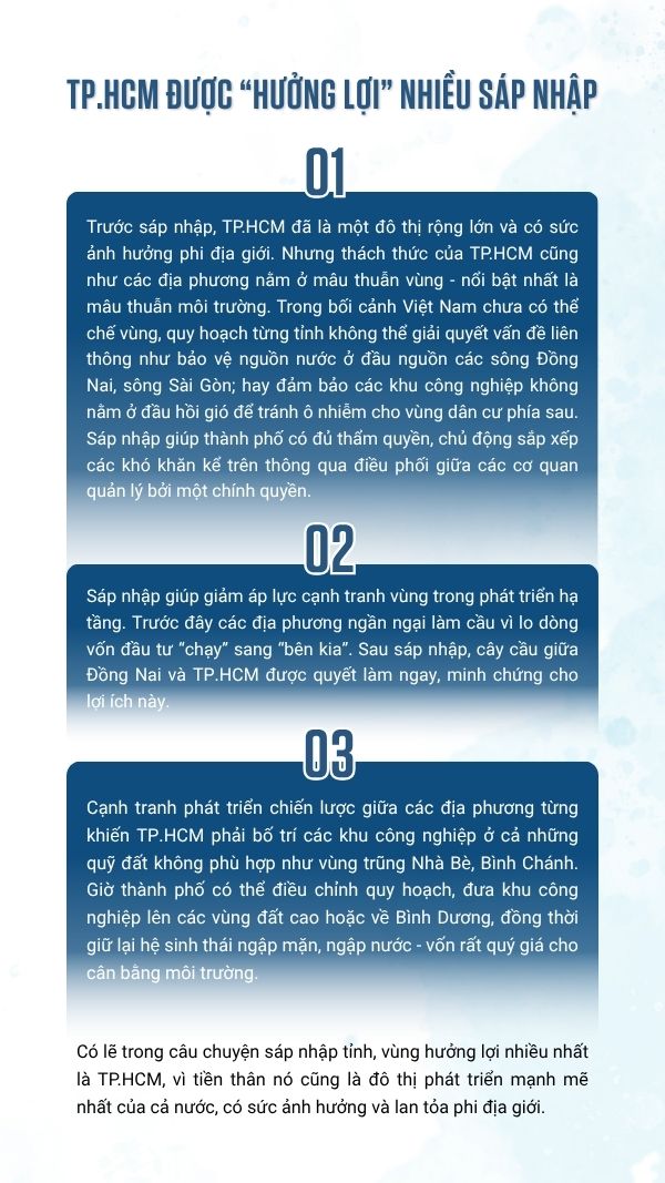 Các con sông từ Đồng Nai, Sài Gòn tới hệ thống kênh rạch, hệ sinh thái ngập nước không chỉ là yếu tố tự nhiên mà còn là trụ cột định hình bản sắc TP.HCM. Sau sáp nhập, cơ hội mở ra để thành phố điều chỉnh quy hoạch, sống xanh hơn, thích ứng biến đổi khí hậu, đồng thời gìn giữ dòng chảy văn hóa của vùng đất Nam Bộ.