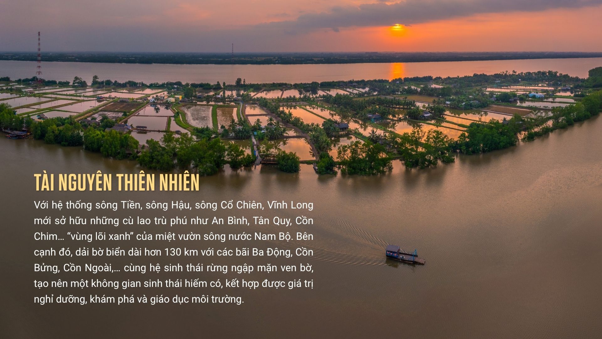Sau khi hợp nhất, Vĩnh Long hình thành một không gian phát triển du lịch giàu tiềm năng, đa dạng và đặc sắc bậc nhất khu vực Đồng bằng sông Cửu Long. Đây là vùng đất hội tụ đầy đủ các điều kiện tự nhiên và nhân văn để kiến tạo nên một hệ sinh thái du lịch toàn diện; từ miệt vườn xanh tươi, sông nước trù phú, đến biển và rừng ngập mặn ven bờ; từ bản sắc Khmer độc đáo cho đến làng nghề, di tích và ẩm thực truyền thống. Cụ thể: