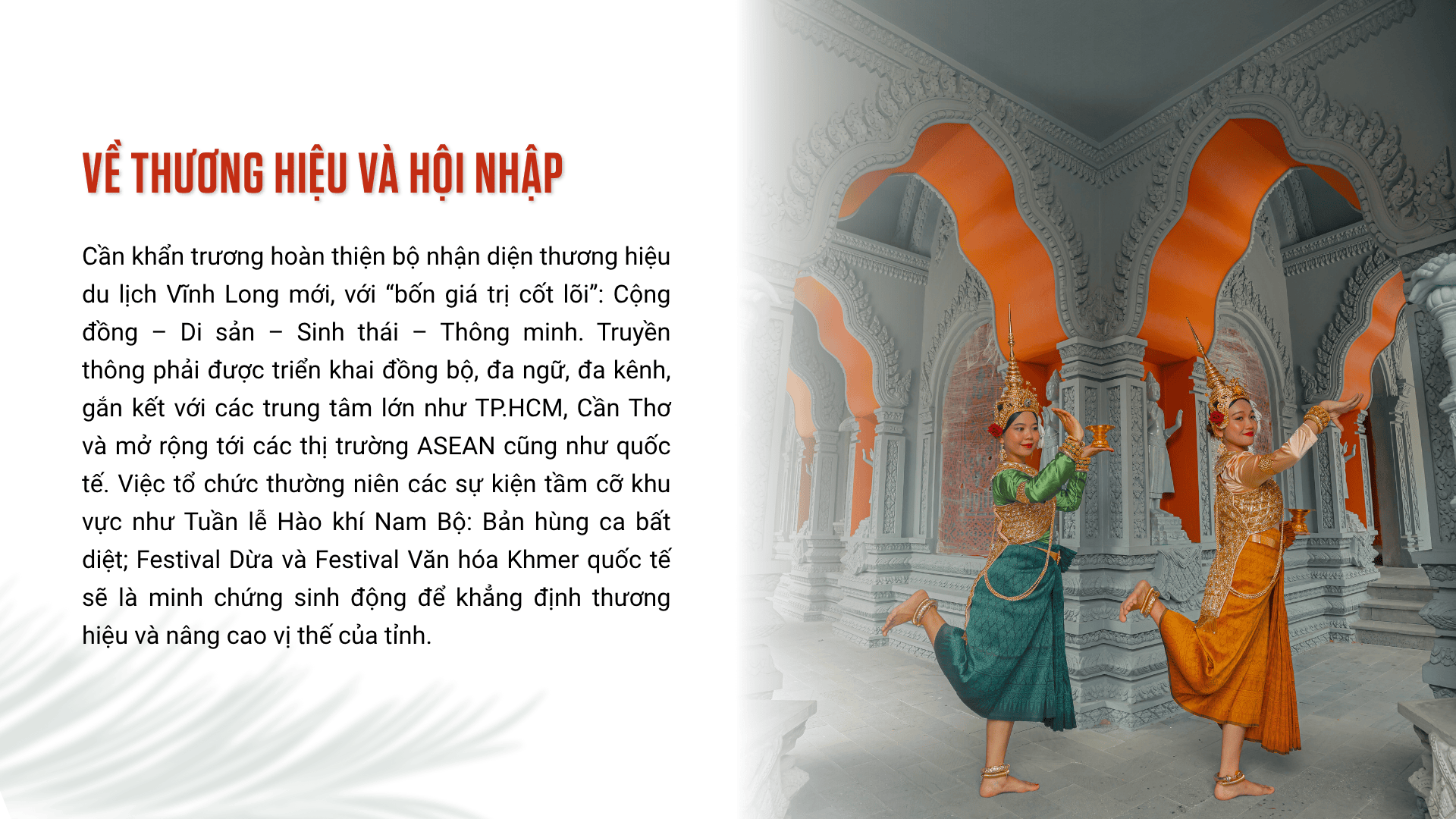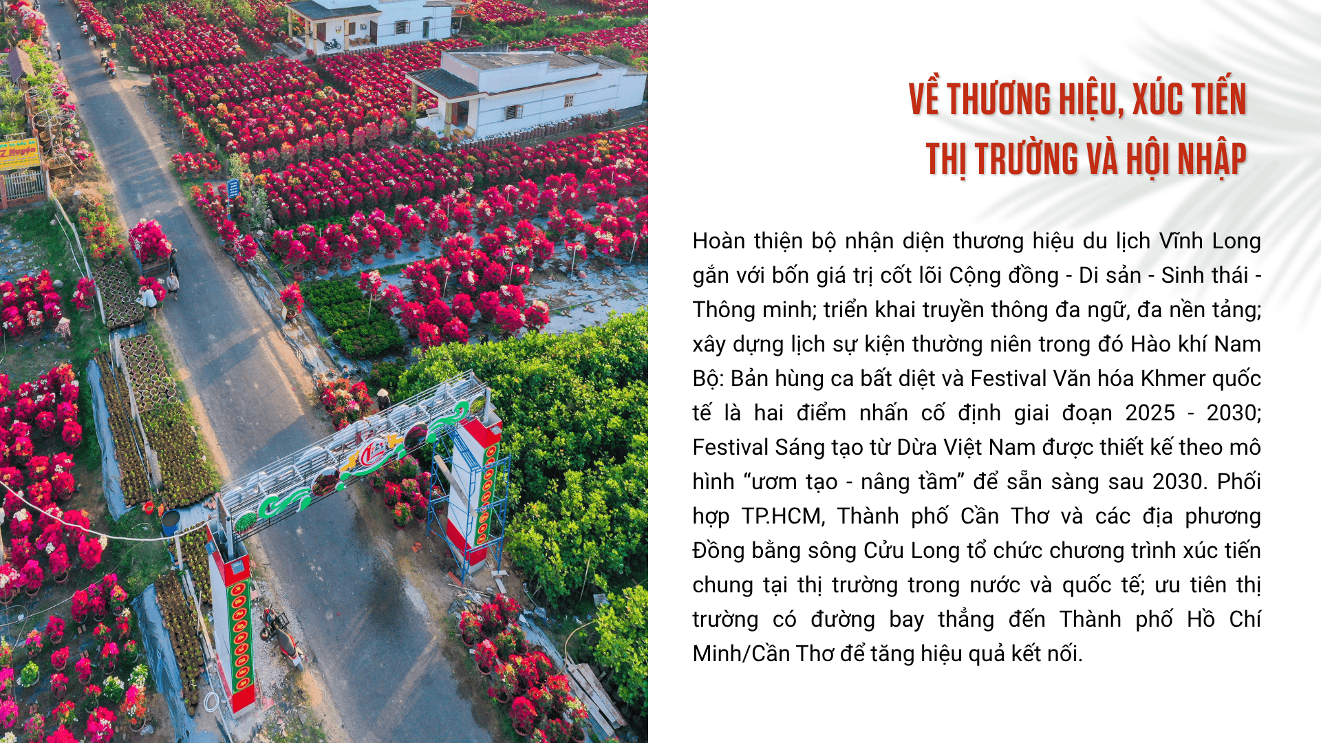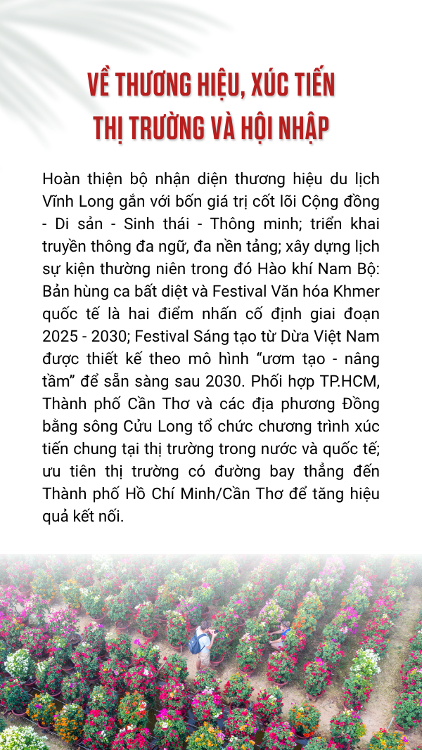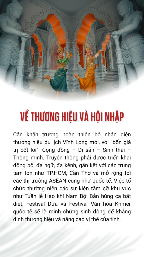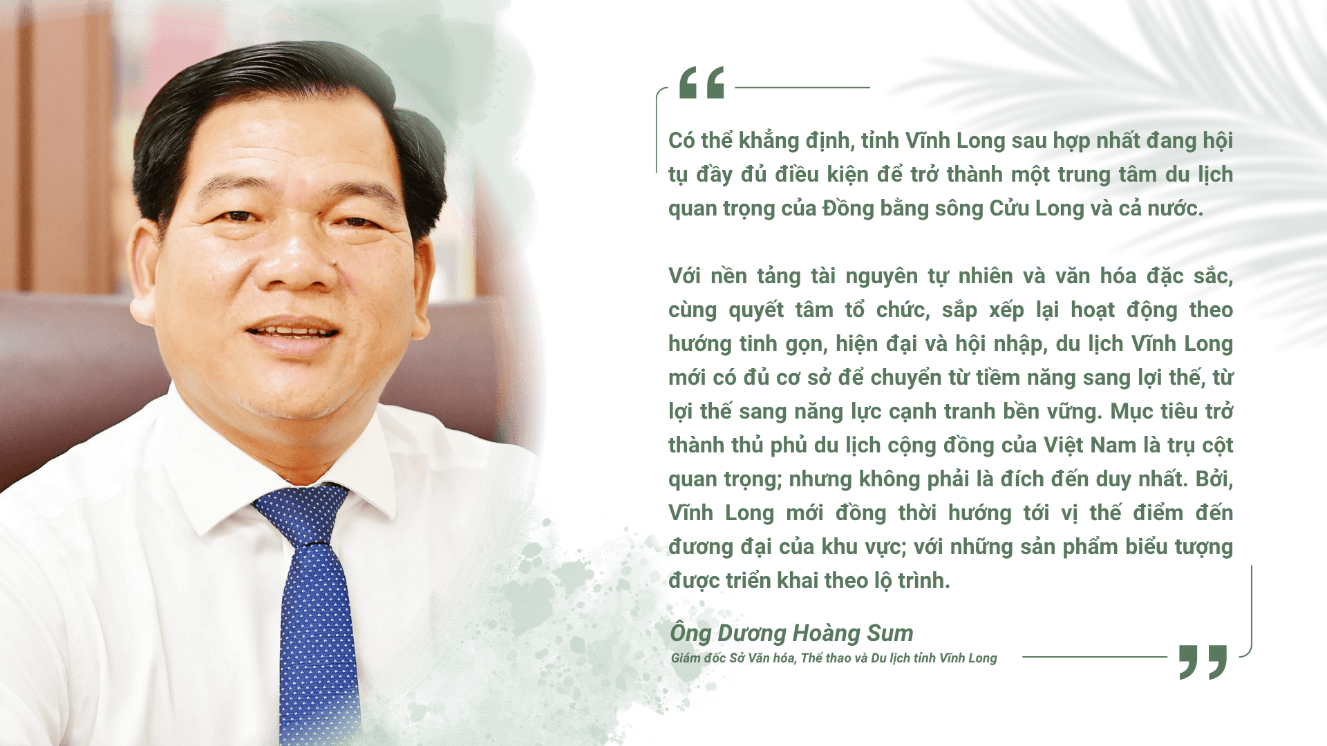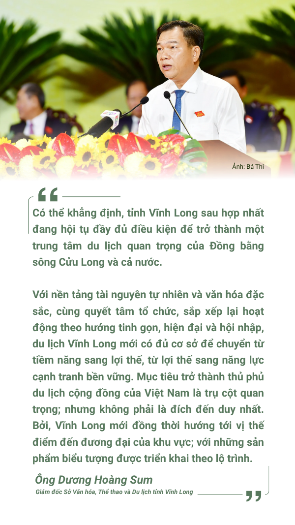 Với các nhóm giải pháp đồng bộ, đặc biệt là việc xác lập danh mục dự án kêu gọi đầu tư chiến lược, gắn với tiêu chí xanh - tuần hoàn - thông minh. Khi các giải pháp này được triển khai nghiêm túc và liên tục, Vĩnh Long mới sẽ không chỉ là thủ phủ du lịch cộng đồng Việt Nam, mà còn là trung tâm lễ hội, cửa ngõ giao lưu văn hóa Mê Kông, điểm đến sinh thái - sáng tạo - thông minh của Nam Bộ, giữ vai trò hạt nhân liên kết của Đồng bằng sông Cửu Long và từng bước khẳng định vị thế trên bản đồ du lịch khu vực và quốc tế.