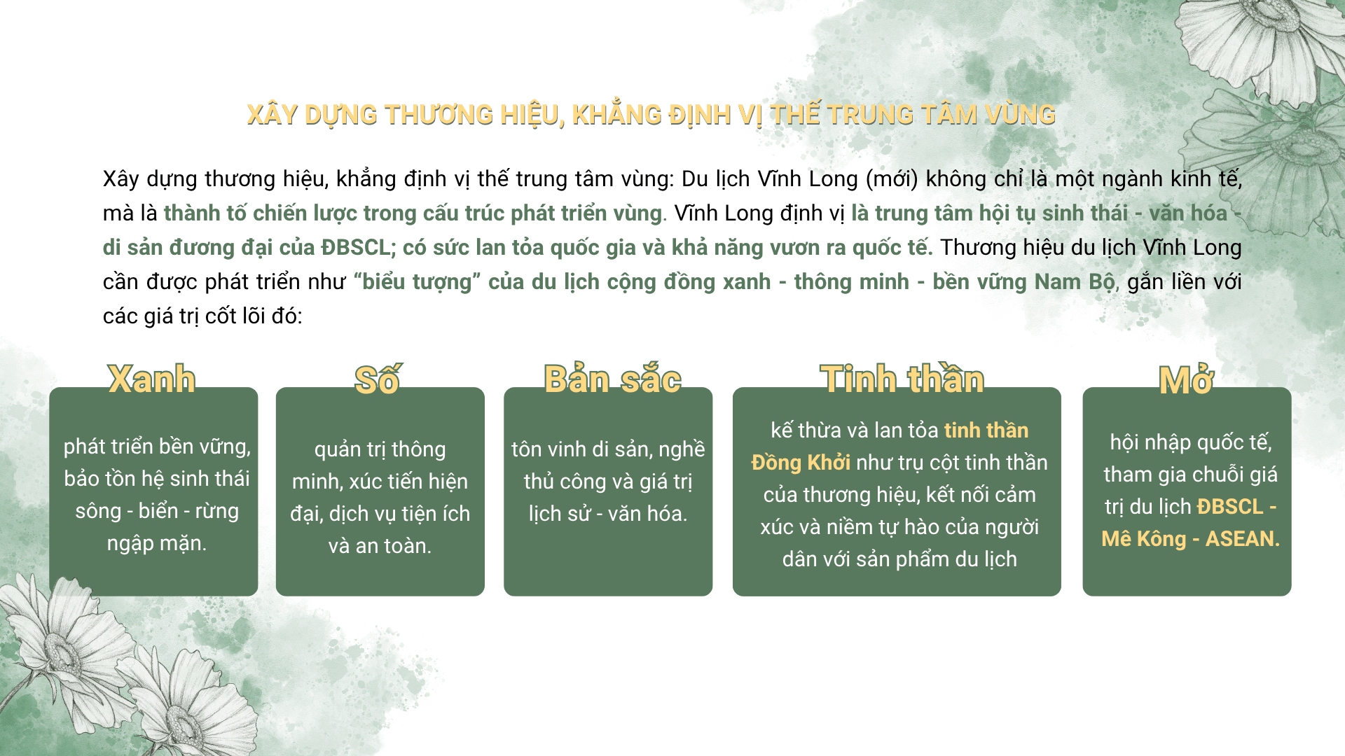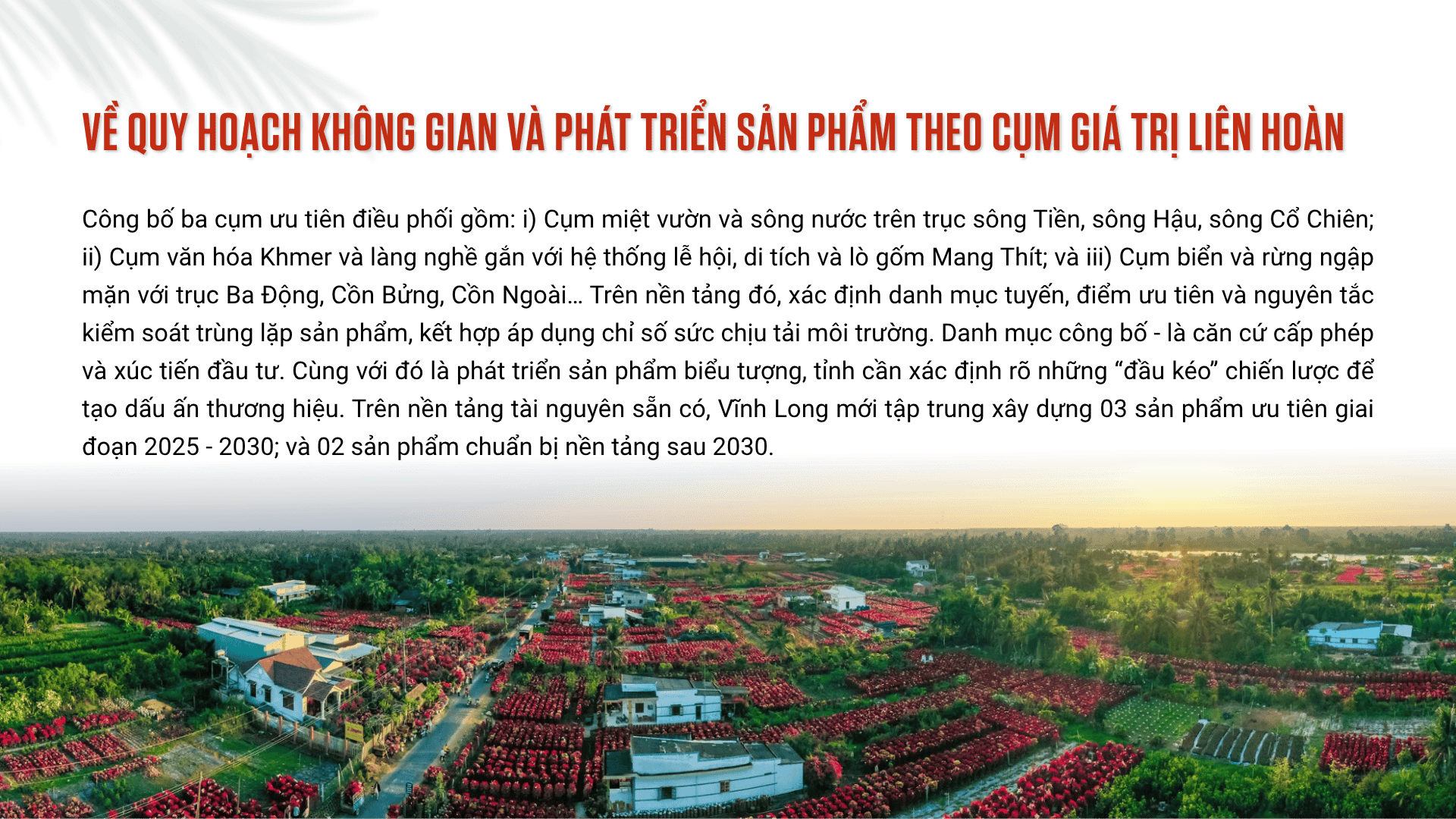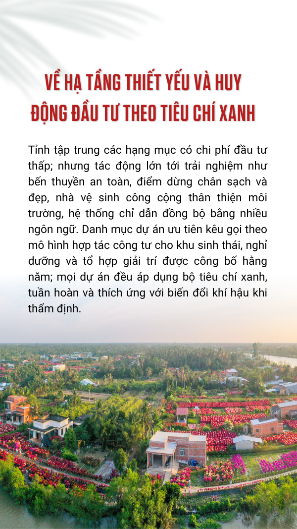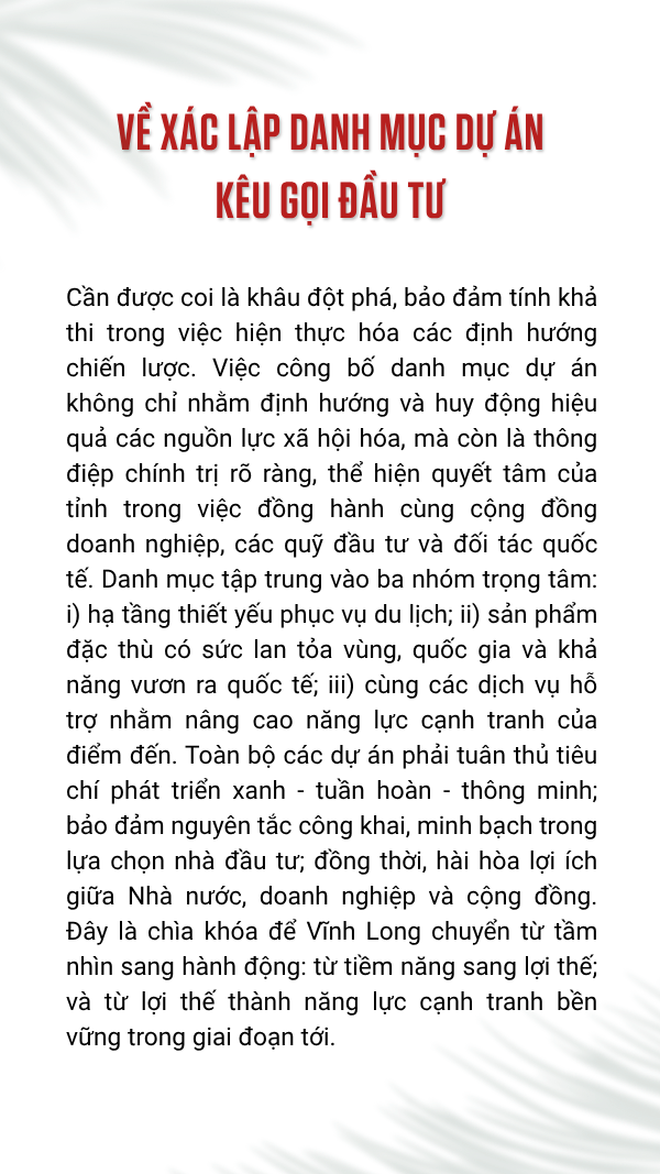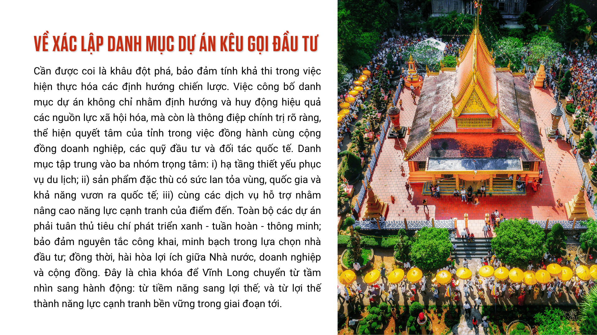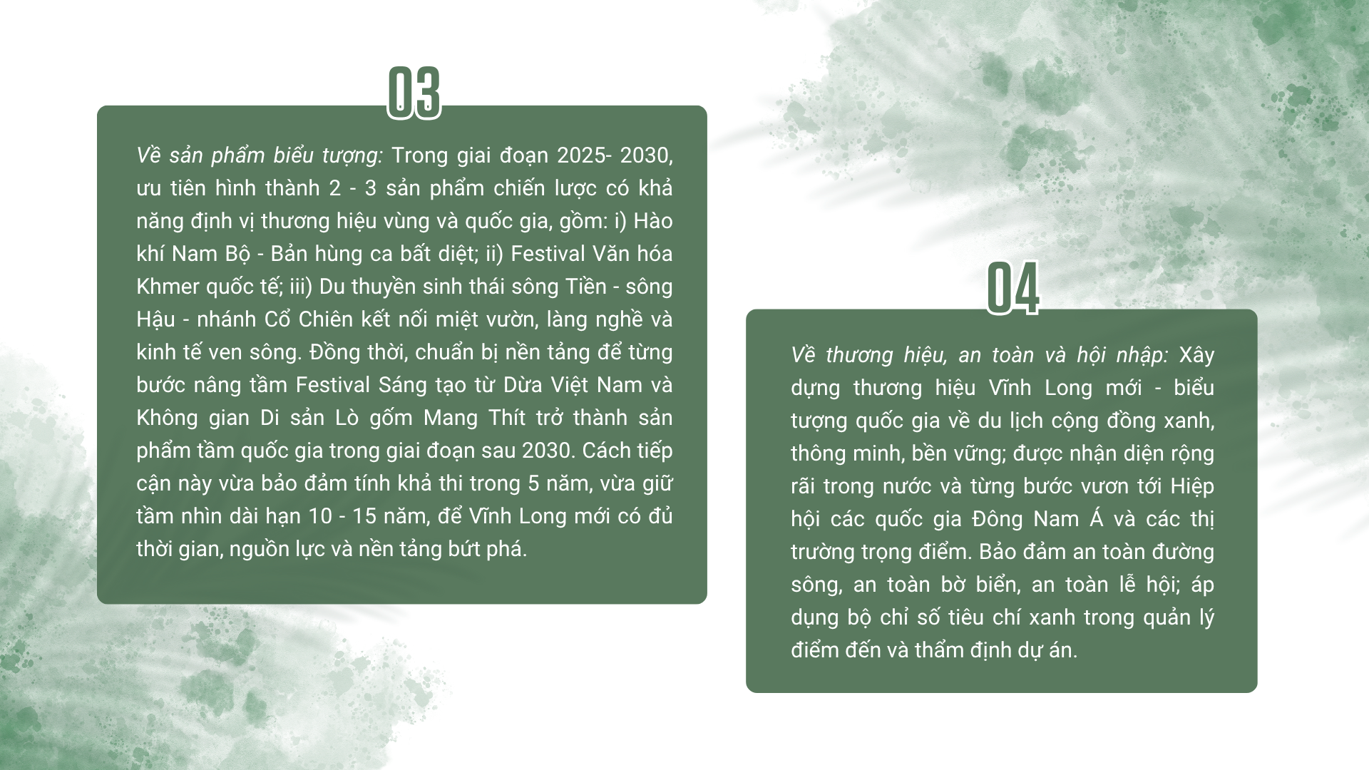 Với các nhóm giải pháp đồng bộ, đặc biệt là việc xác lập danh mục dự án kêu gọi đầu tư chiến lược, gắn với tiêu chí xanh - tuần hoàn - thông minh. Khi các giải pháp này được triển khai nghiêm túc và liên tục, Vĩnh Long mới sẽ không chỉ là thủ phủ du lịch cộng đồng Việt Nam, mà còn là trung tâm lễ hội, cửa ngõ giao lưu văn hóa Mê Kông, điểm đến sinh thái - sáng tạo - thông minh của Nam Bộ, giữ vai trò hạt nhân liên kết của Đồng bằng sông Cửu Long và từng bước khẳng định vị thế trên bản đồ du lịch khu vực và quốc tế.