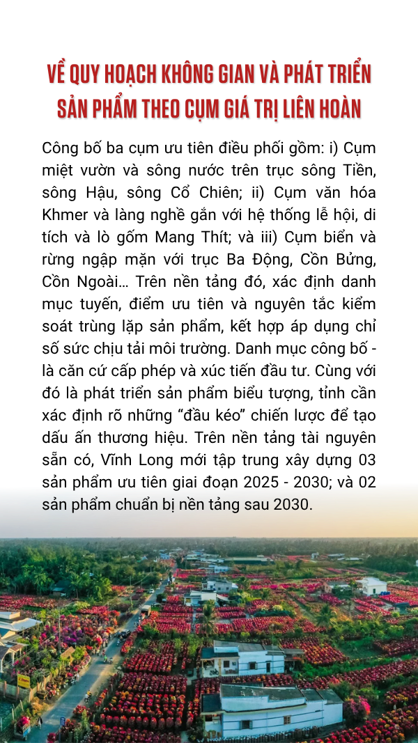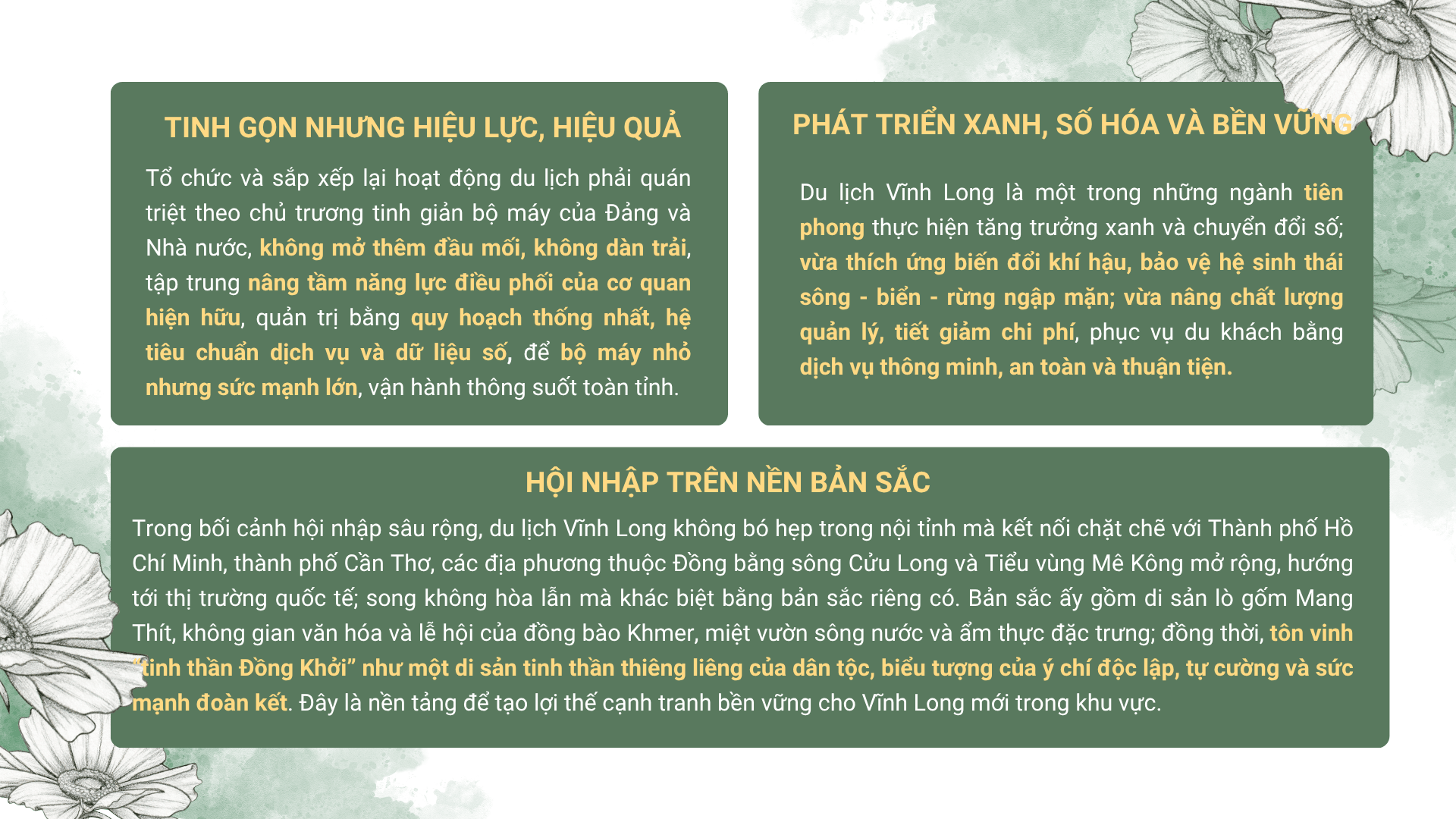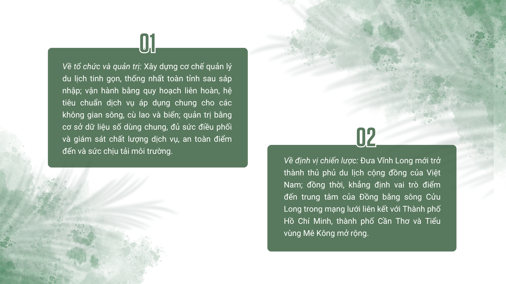 Trong bối cảnh Đảng và Nhà nước kiên định chủ trương tinh giản bộ máy, thúc đẩy chuyển đổi số và phát triển kinh tế xanh, du lịch Vĩnh Long cần được quản lý bằng một tư duy mới. Theo đó, ngành du lịch Vĩnh Long không tăng đầu mối tổ chức, mà đổi mới phương thức quản lý; không phát triển manh mún, mà kiến tạo chuỗi giá trị liên hoàn; không chỉ khai thác lợi thế tài nguyên, mà còn phải chuyên nghiệp hóa sản phẩm, nâng cao chất lượng dịch vụ, xây dựng thương hiệu và tạo dựng danh tiếng địa phương trên nền tảng quản trị hiện đại.