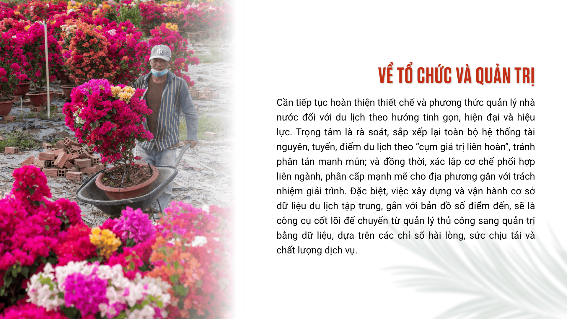 Có thể khẳng định rằng, Vĩnh Long mới sở hữu hệ tài nguyên tự nhiên - văn hóa rất phong phú, cùng nền tảng hạ tầng đón khách đang cải thiện nhanh. Tuy nhiên, sau sáp nhập, toàn ngành phải đối mặt yêu cầu mới về quản trị thống nhất, khắc phục phân tán sản phẩm và nâng chất lượng dịch vụ theo một chuẩn chung. Vì vậy, cần một phương thức tổ chức mới dựa trên tinh gọn bộ máy, quản trị bằng quy hoạch liên hoàn, tiêu chuẩn dịch vụ và dữ liệu số; đồng thời, phát triển sản phẩm biểu tượng mang sức lan tỏa vùng để chuyển hóa tiềm năng thành lợi thế cạnh tranh thực sự.