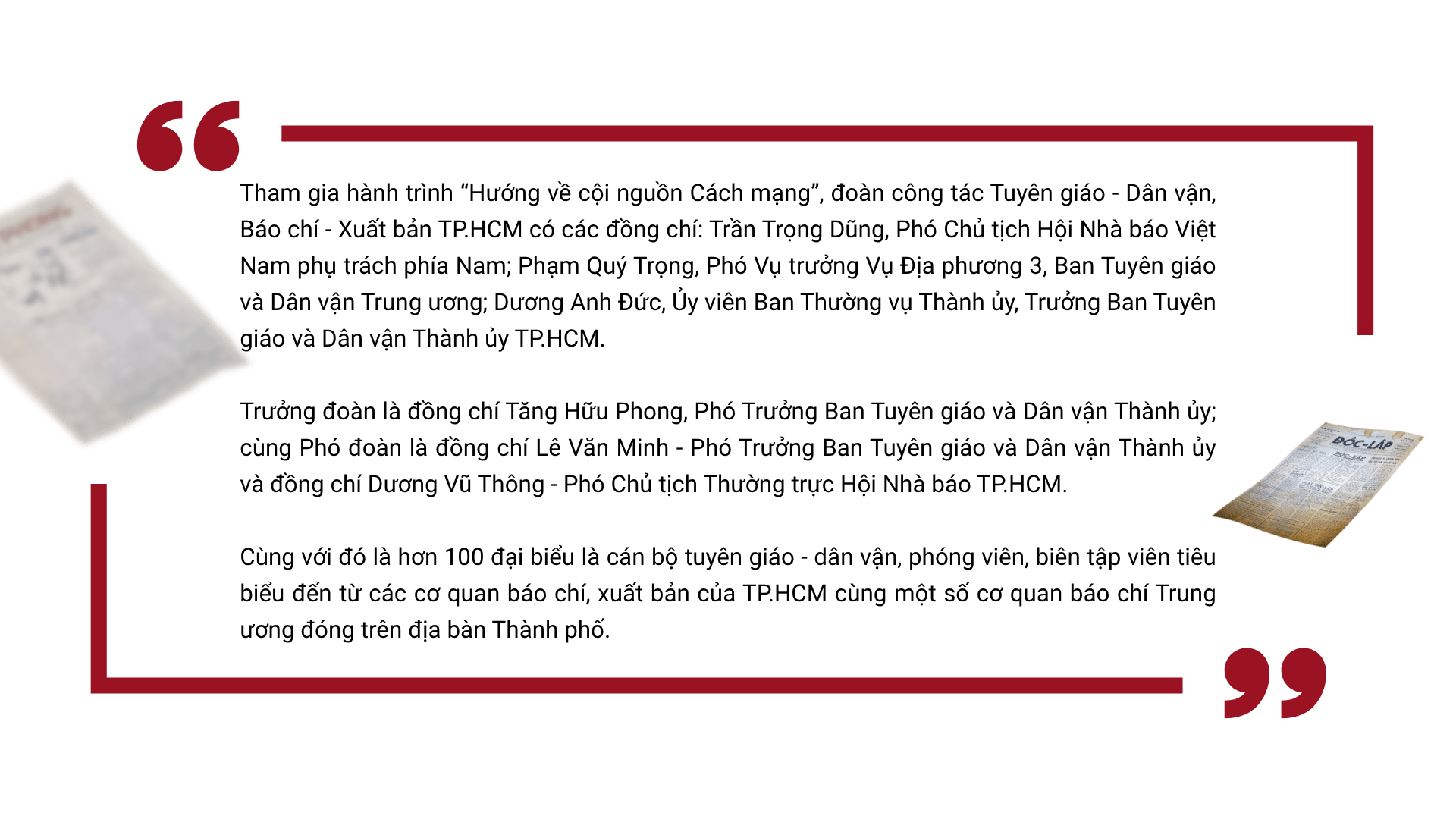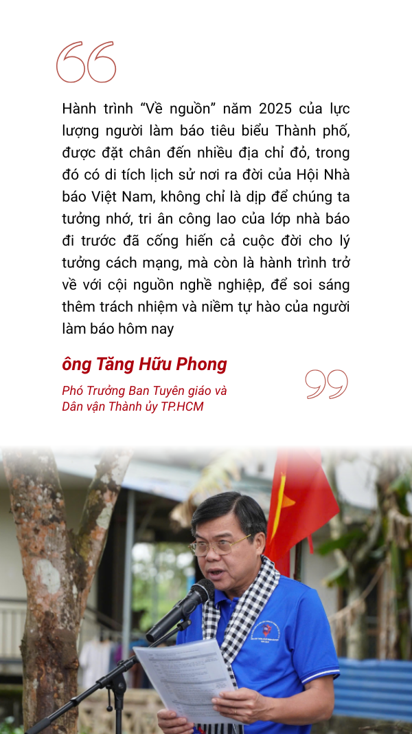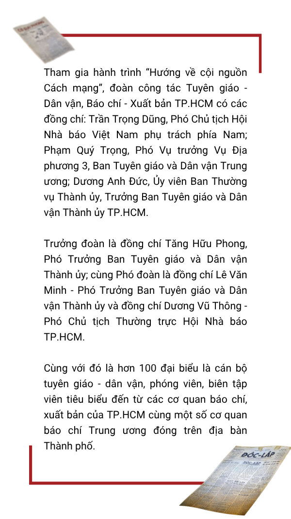 Hành trình “Hướng về cội nguồn Cách mạng” của đoàn công tác Tuyên giáo -Dân vận, Báo chí - Xuất bản TP.HCM là hoạt động chính trị - xã hội ý nghĩa, thể hiện tình cảm, trách nhiệm và lòng biết ơn của đội ngũ tuyên giáo, dân vận, báo chí, xuất bản tại Thành phố mang tên Bác đối với thế hệ đi trước, góp phần bồi dưỡng nhận thức chính trị, đạo đức nghề nghiệp, nâng cao chất lượng công tác tuyên truyền, cổ vũ phong trào thi đua yêu nước trong giai đoạn mới.