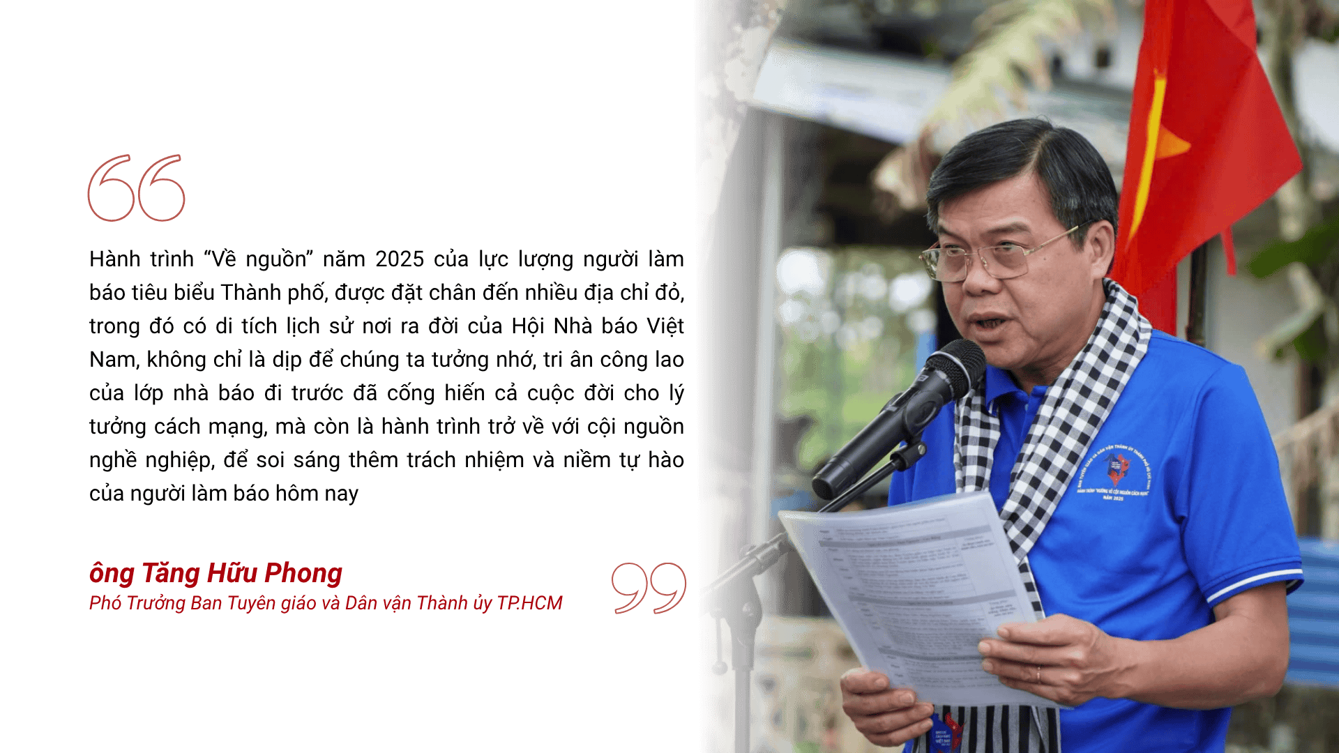 “Trở lại nguồn cội của cách mạng hôm nay, tôi thấy mình được tiếp thêm sức mạnh - sức mạnh để giữ ngòi bút luôn trong sáng, để viết vì con người và vì Tổ quốc. Xin được cúi đầu tri ân các thế hệ nhà báo đi trước, những người đã thắp lên ngọn lửa nghề và gìn giữ nó bằng cả cuộc đời mình. Chúng tôi - những người làm báo hôm nay xin nguyện giữ trọn ngọn lửa ấy, để dù ở bất cứ miền đất nào, vẫn luôn sáng tạo bằng trái tim trung thực và niềm tin không đổi, để góp phần dựng xây đất nước hùng cường trong kỷ nguyên phát triển mới, kỷ nguyên vươn mình của dân tộc!” – Phóng viên Nguyệt Nhi – Báo Pháp luật TP.HCM