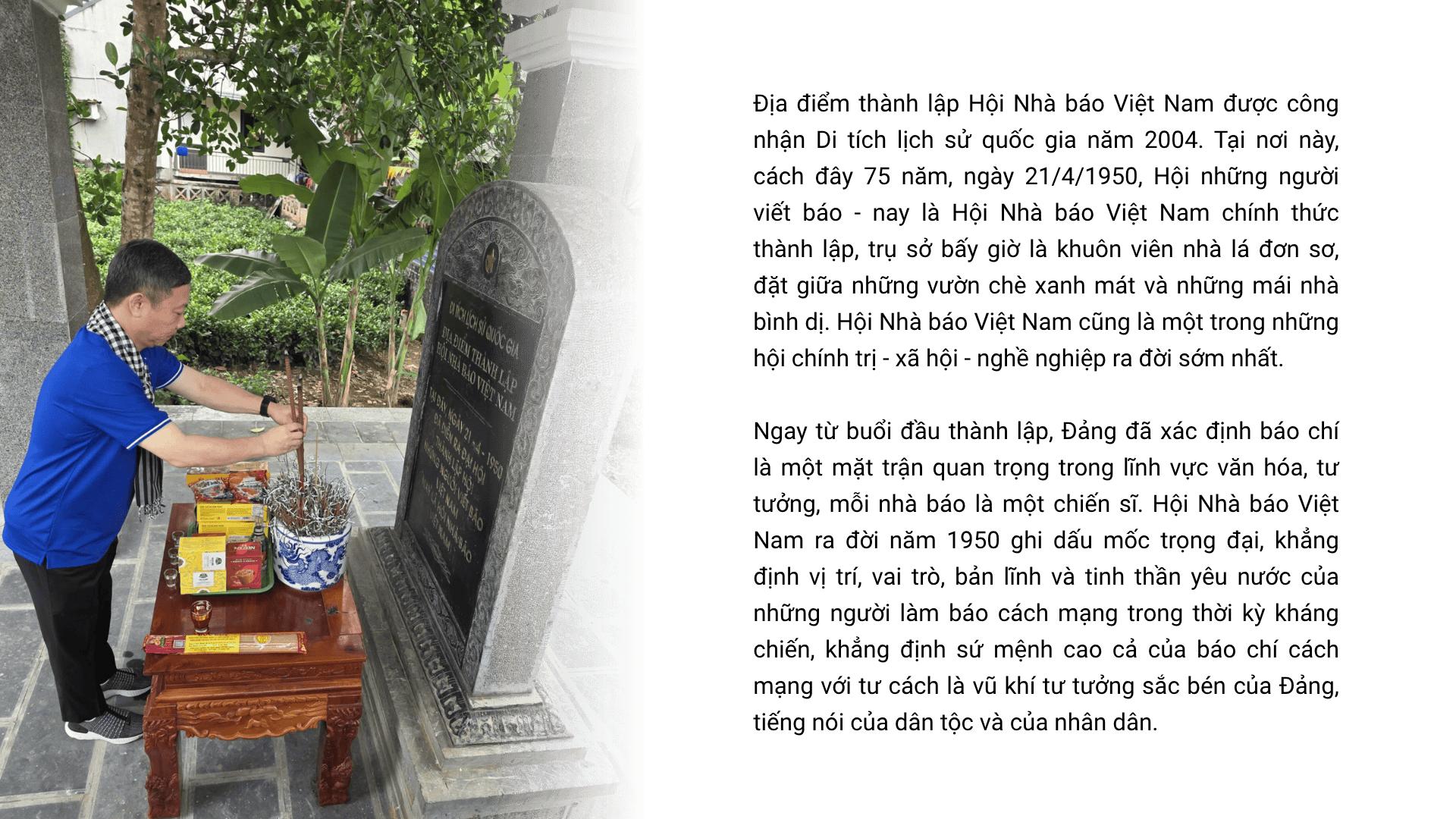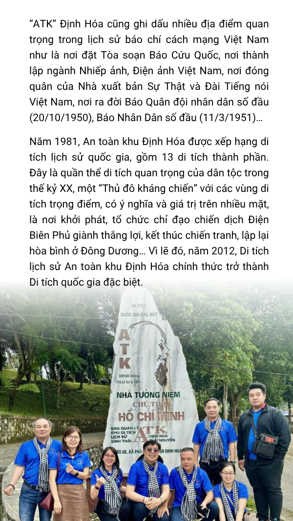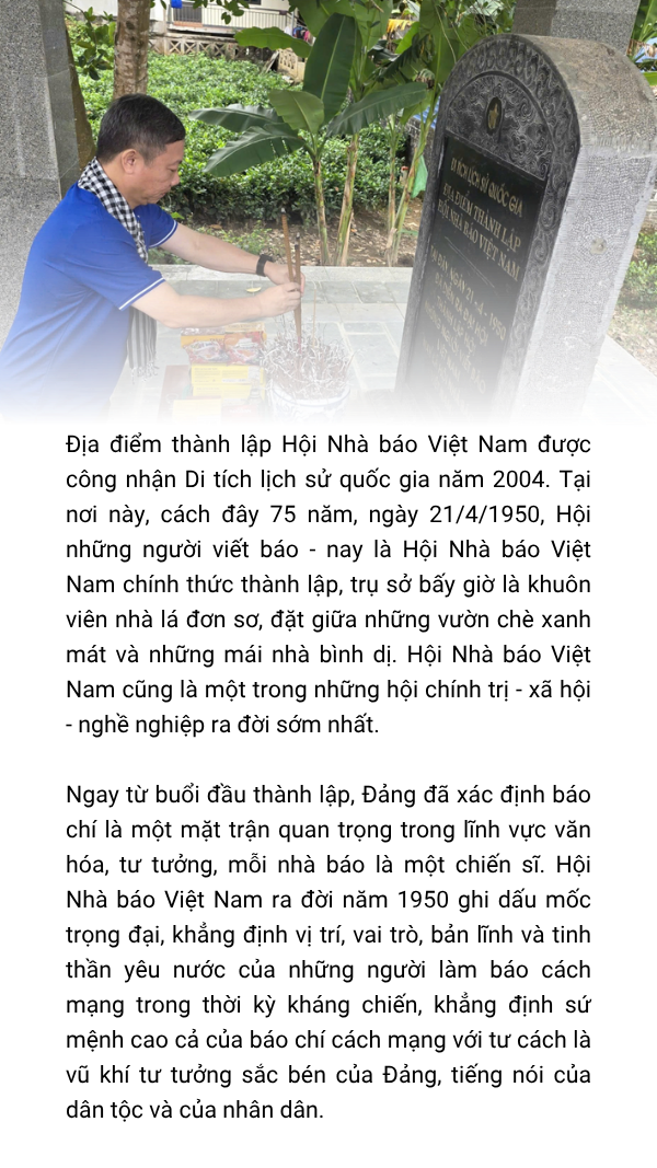 Theo Phó Trưởng Ban Tuyên giáo và Dân vận Thành ủy Tăng Hữu Phong, khu di tích lịch sử quốc gia này ghi dấu sự ra đời của Hội Nhà báo Việt Nam vào năm 1950 - một dấu mốc trọng đại khẳng định vị trí, vai trò, bản lĩnh và tinh thần yêu nước của những người làm báo cách mạng trong thời kỳ kháng chiến. Nơi đây, vượt qua muôn ngàn gian khổ trong cuộc kháng chiến chống thực dân Pháp, những nhà báo cách mạng đầu tiên đã cùng nhau khẳng định sứ mệnh cao cả của báo chí cách mạng: là vũ khí tư tưởng sắc bén của Đảng, là tiếng nói của dân tộc và của nhân dân.