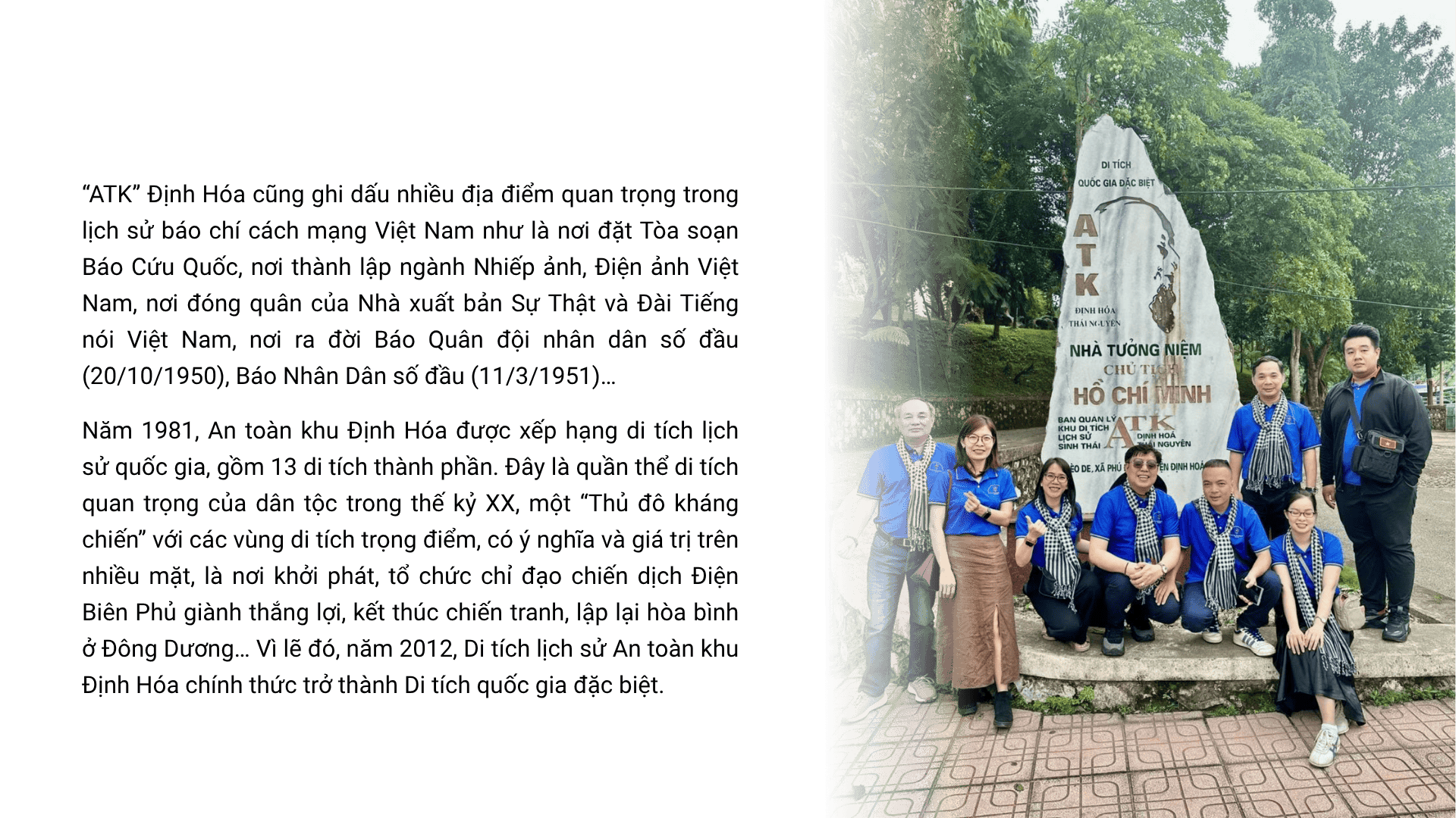 Đặc biệt, đoàn công tác tuyên giáo - dân vận, báo chí - xuất bản TP.HCM đã đến thăm di tích Trường dạy làm báo Huỳnh Thúc Kháng tại xã Tân Thái, huyện Đại Từ, nay là xã Đại Phúc, Thái Nguyên. Trong kháng chiến chống Pháp, ATK Định Hóa không chỉ là đại bản doanh của Trung ương Đảng, Chính phủ và các cơ quan Trung ương, mà còn là nơi đặt trụ sở các cơ quan báo chí, văn hóa nghệ thuật.